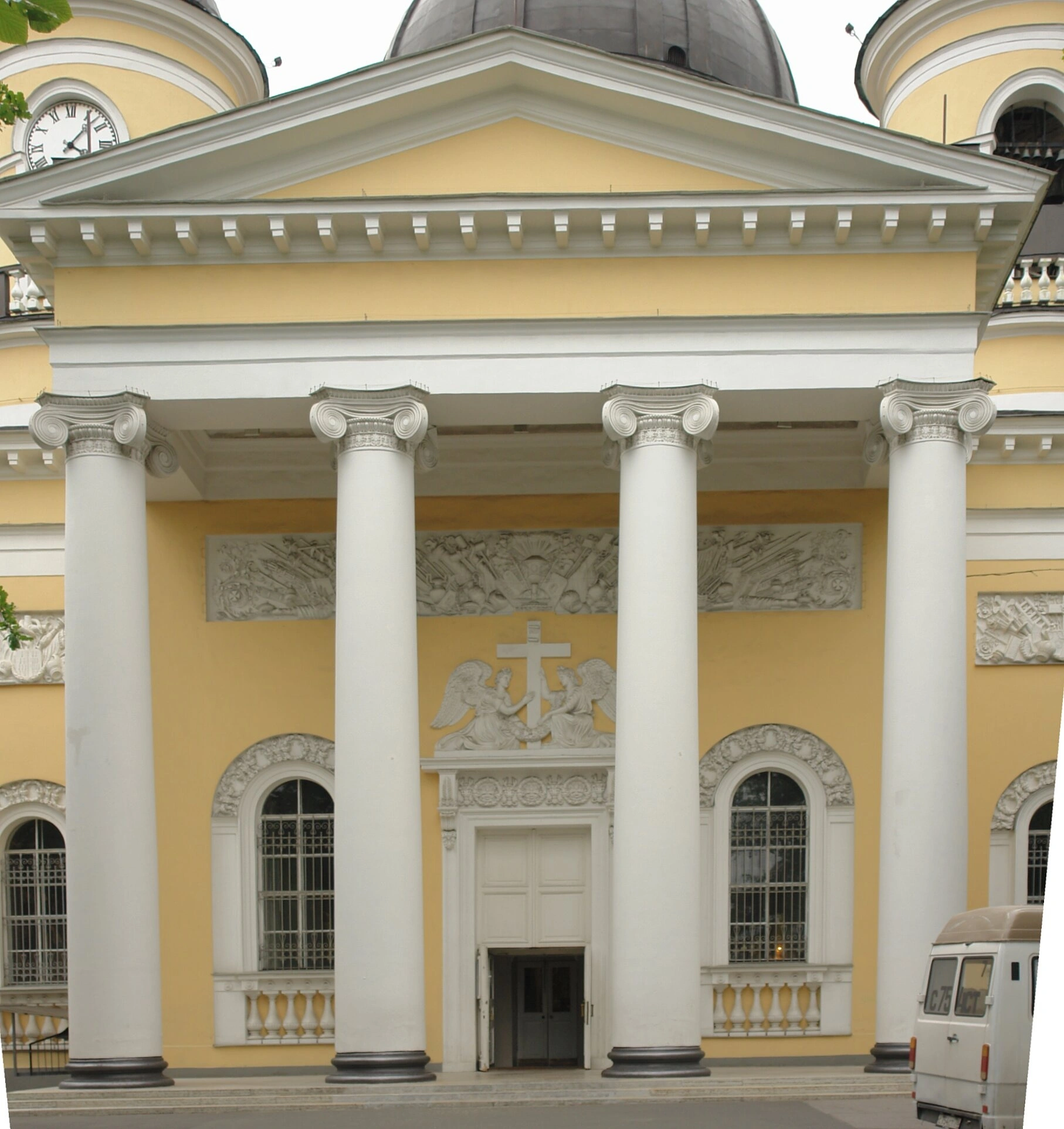 Фотография позволяет в деталях рассмотреть центральную часть западного фасада. Главный вход торжественно оформлен монументальным портиком с четырьмя белоснежными колоннами, увенчанными треугольным фронтоном. Над вратами расположен искусно выполненный барельеф, изображающий крест с предстоящими ангелами. Стены собора окрашены в тёплый жёлтый цвет, который гармонично сочетается с белым декором, подчёркивая строгость и благородство классических линий. В левой части кадра виднеется часть одного из малых куполов, а также башня с часовым циферблатом. Арочные окна первого яруса с коваными решётками и изящная балюстрада перед ними дополняют архитектурный ансамбль, демонстрируя симметрию и величие, свойственные эпохе ампира.