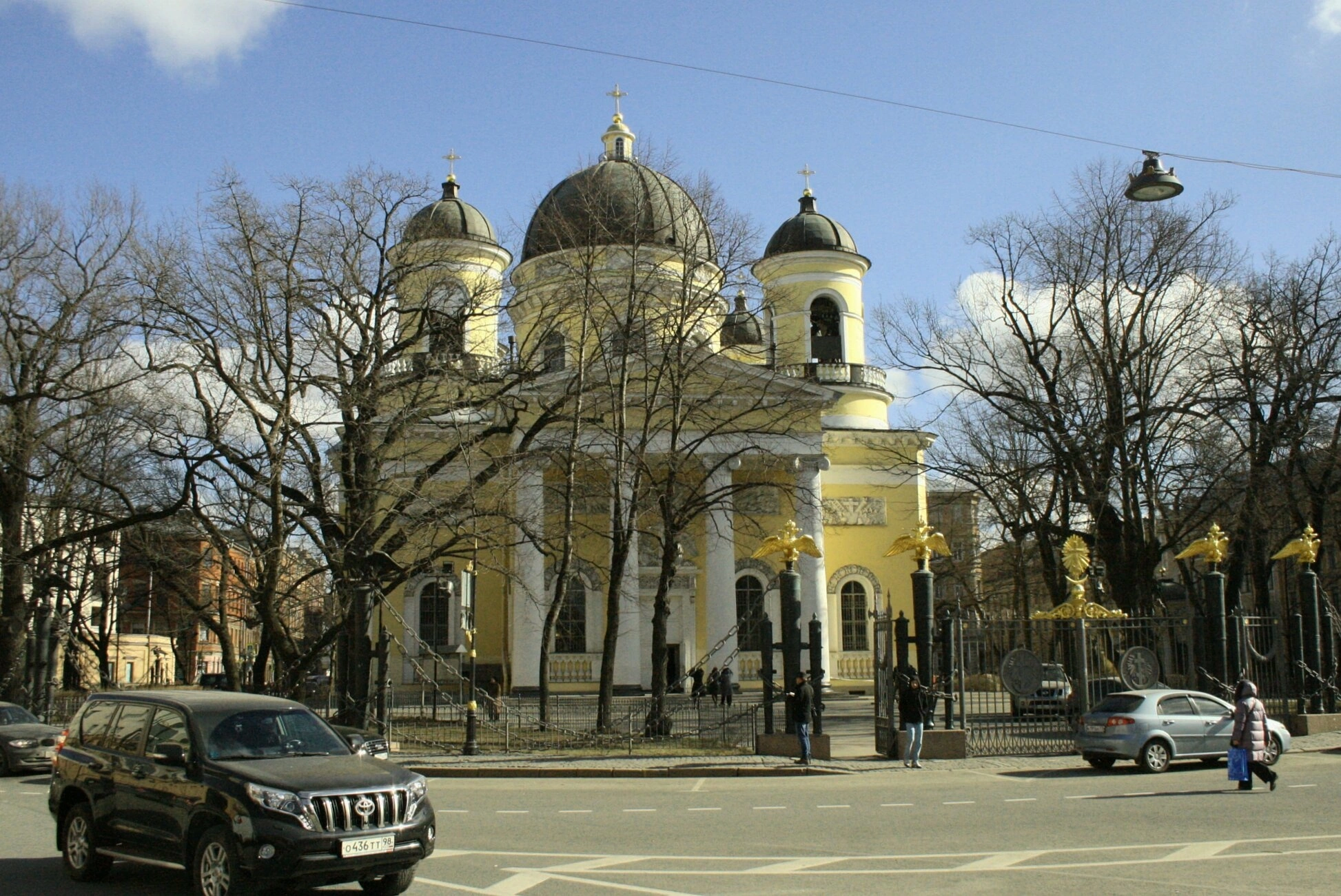 На представленной фотографии запечатлён величественный Спасо-Преображенский собор, что пребывает в Санкт-Петербурге на Преображенской площади. Снимок сделан в ясный день, вероятно, в преддверии весны, когда природа только пробуждается, и кроны деревьев ещё прозрачны, что позволяет в полной мере созерцать благолепие храмового здания.
