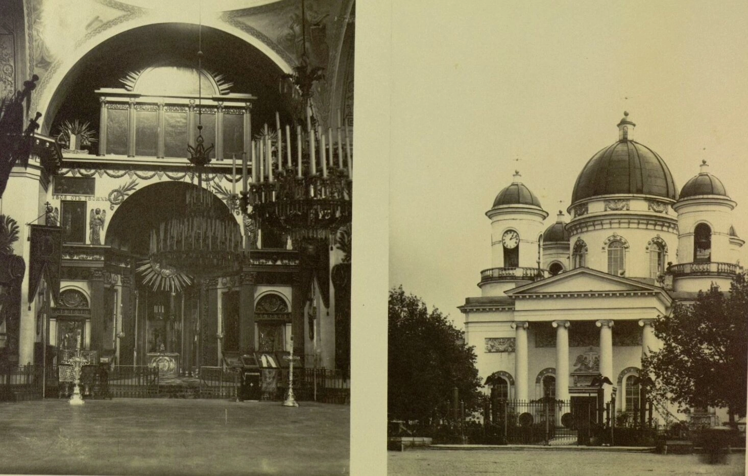 Правая часть фотографии являет внешний облик собора. Главный фасад храма представлен торжественным классическим портиком с четырьмя мощными колоннами, несущими треугольный фронтон. Венчает здание монументальный тёмный центральный купол, окружённый по углам четырьмя меньшими главками. На одной из башенок хорошо различимы установленные часы с циферблатом. Перед строгим и величественным фасадом, выполненным в лучших традициях русского классицизма, простирается ограда, а по бокам растут деревья, мягко обрамляя каменную громаду.