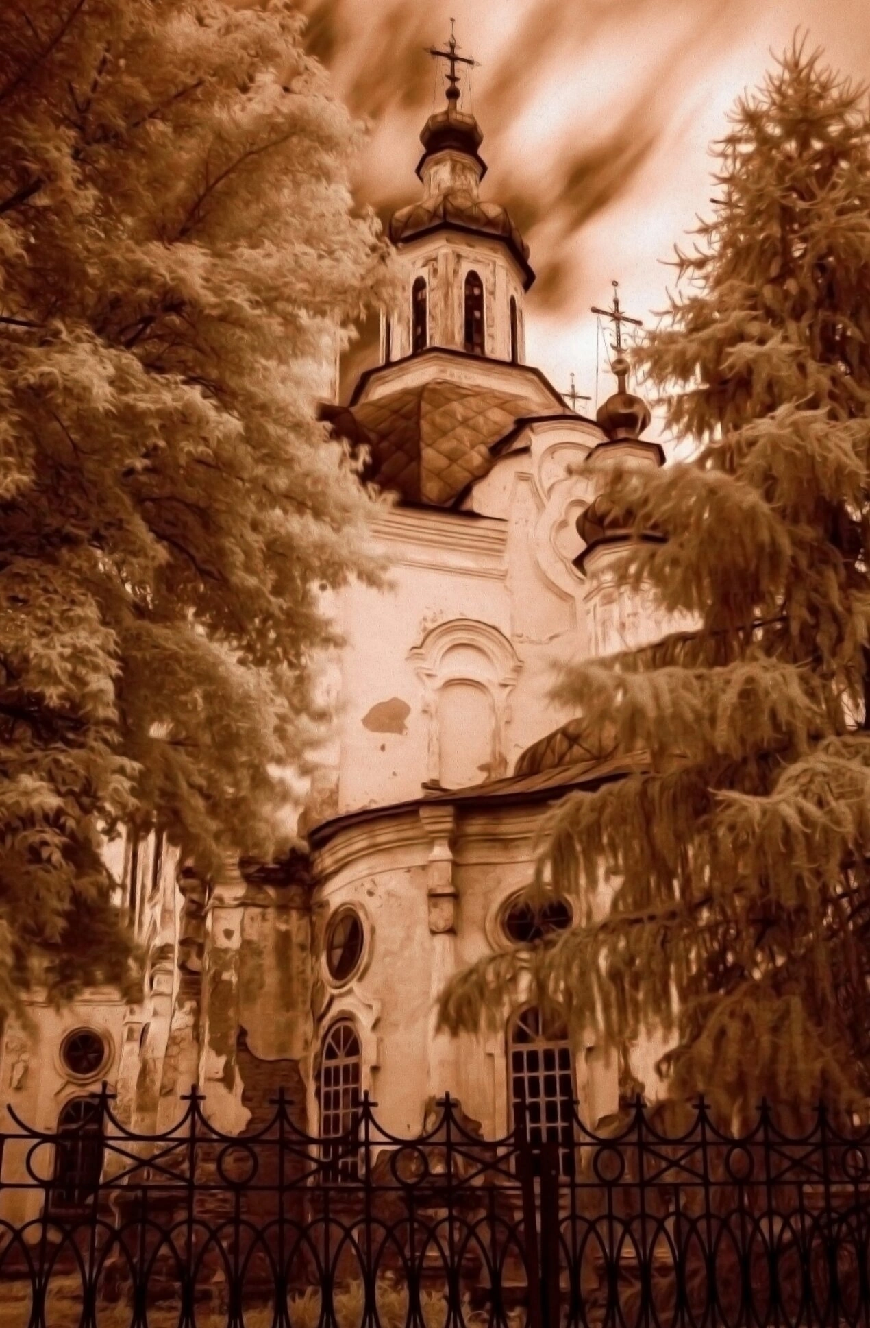 На фотографии запечатлен Спасо-Преображенский собор, расположенный в городе Шадринске Курганской области. Этот православный храм является старейшей каменной постройкой города и обладает статусом объекта культурного наследия федерального значения. Собор представляет собой выдающийся памятник церковной архитектуры, выполненный в стиле сибирского барокко.