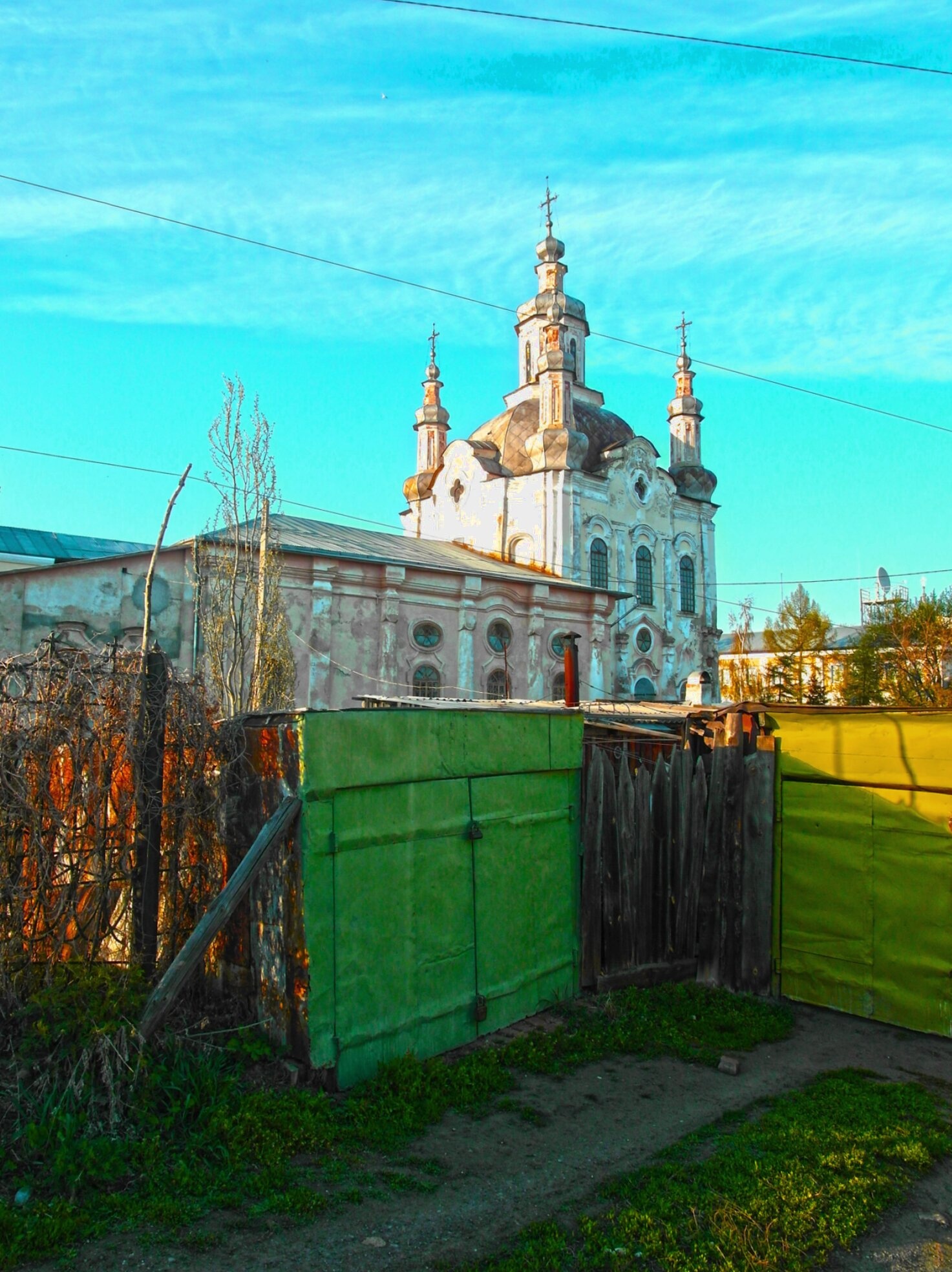На представленной фотографии запечатлён величественный Спасо-Преображенский собор, расположенный в историческом центре города Шадринска. Этот православный храм, являющийся кафедральным собором Шадринской епархии, представляет собой выдающийся памятник русского церковного зодчества второй половины XIX века.