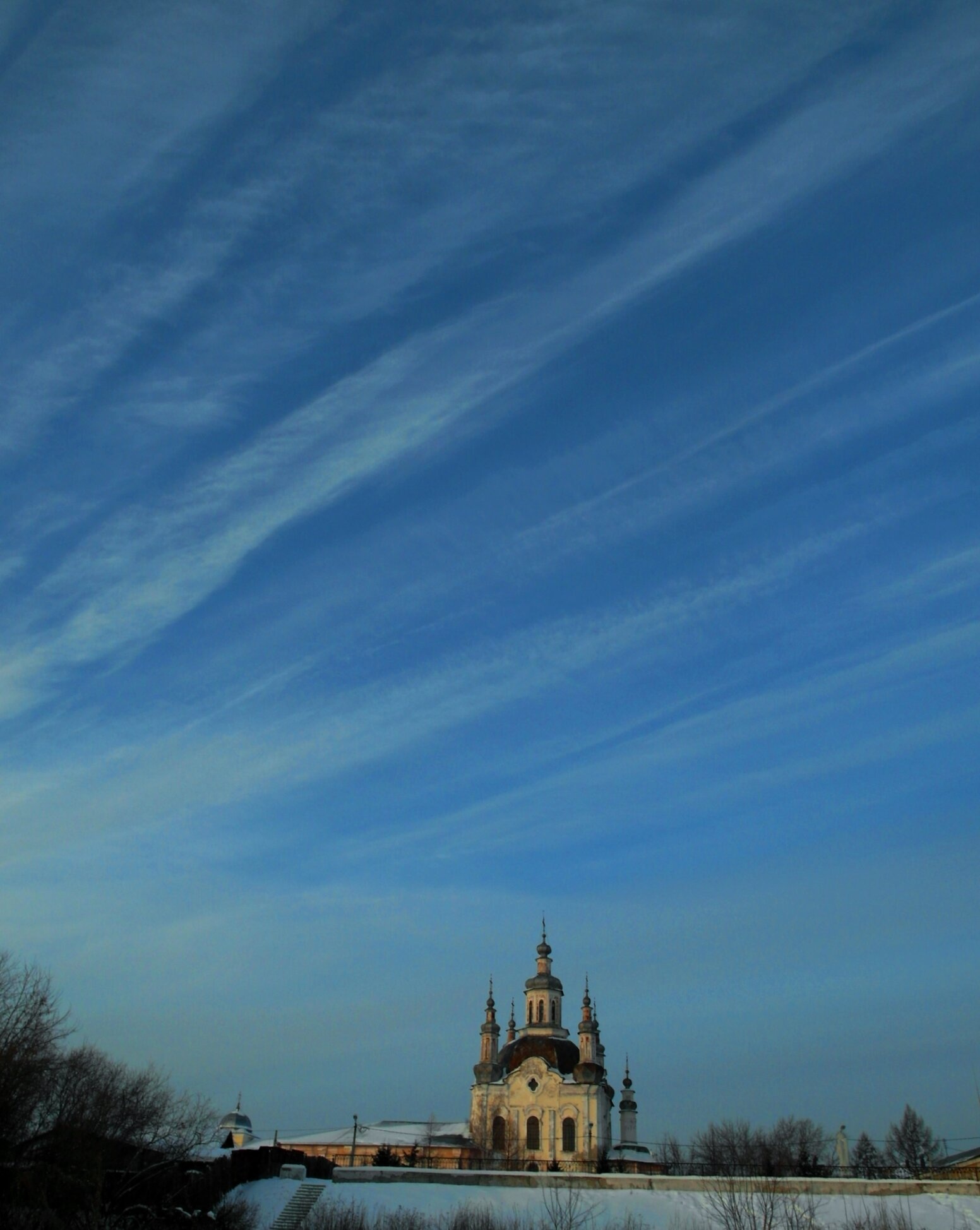 На фотографии запечатлён Спасо-Преображенский собор города Шадринска — старейшее каменное здание, духовный символ и архитектурная доминанта города. Собор, освящённый в честь Преображения Господня, был возведён в 1771–1777 годах по благословению епископа Тобольского Варлаама. Строительством руководил настоятель Успенского Далматовского монастыря игумен Адам (Аркудинский).