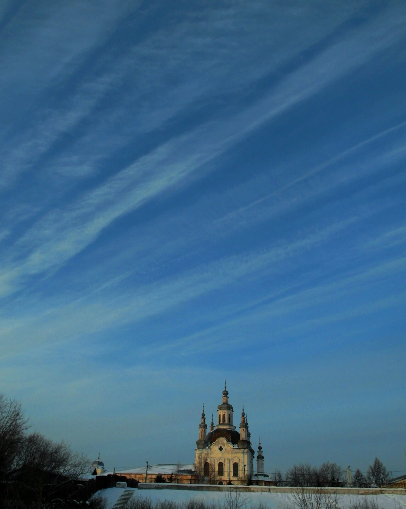 В зимний период, запечатлённый на снимке, собор выглядит особенно величественно. Снежный покров подчёркивает изящные очертания светлых стен и тёмных куполов, устремлённых к небу. Контраст тёплого цвета стен, выполненных в светлых тонах, с насыщенной синевой неба и белизной снега создаёт возвышенное настроение, соответствующее духовному значению этого места.