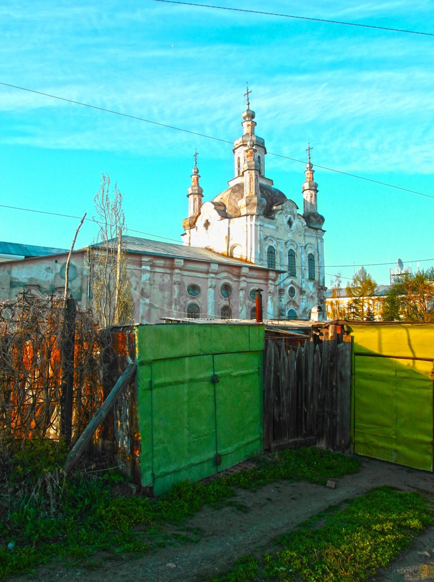 На представленной фотографии запечатлён величественный Спасо-Преображенский собор, являющийся одной из главных православных святынь города Шадринска. Монументальный храм, возвышающийся под ясным небесным сводом, поражает своим благолепием и духовной мощью.