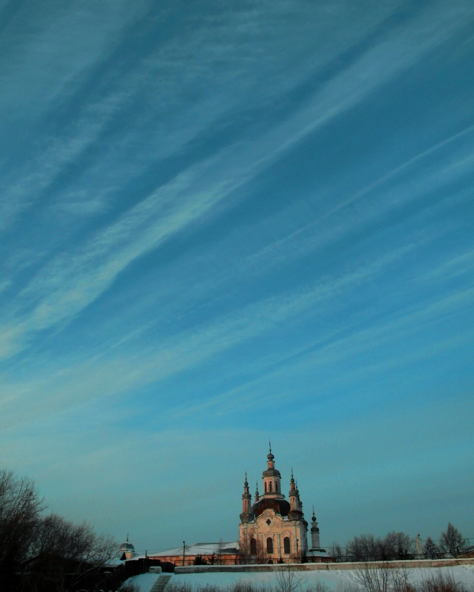 На фотографии хорошо просматривается мощный кубический объём храма, увенчанный массивным световым барабаном с луковичной главой, водружённой на высокий купол. Фасад украшен килевидными закомарами и арочными оконными проёмами, что создаёт ощущение величия и устремлённости ввысь, к небесам. Рядом высится колокольня, составляющая единый архитектурный ансамбль с основным зданием.