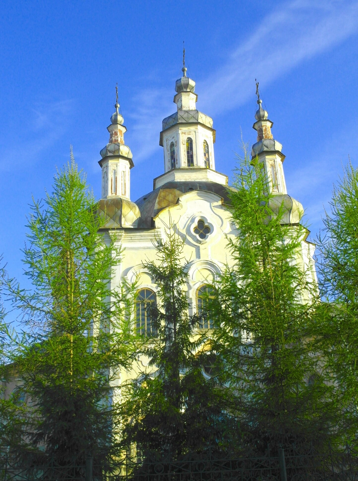 На представленной фотографии запечатлён Спасо-Преображенский собор — кафедральный храм Шадринской епархии Русской Православной Церкви, расположенный в городе Шадринске Курганской области. Этот величественный православный собор является одним из старейших каменных храмов Зауралья и архитектурной доминантой исторического центра города.