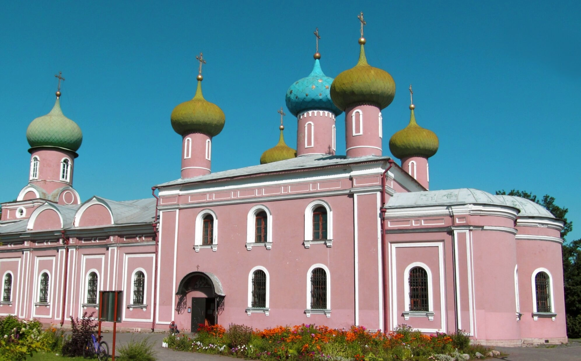 На представленной фотографии запечатлён величественный Спасо-Преображенский собор, расположенный в древнем городе Тихвине Ленинградской области. Этот православный храм является выдающимся памятником церковной архитектуры и духовным центром региона.