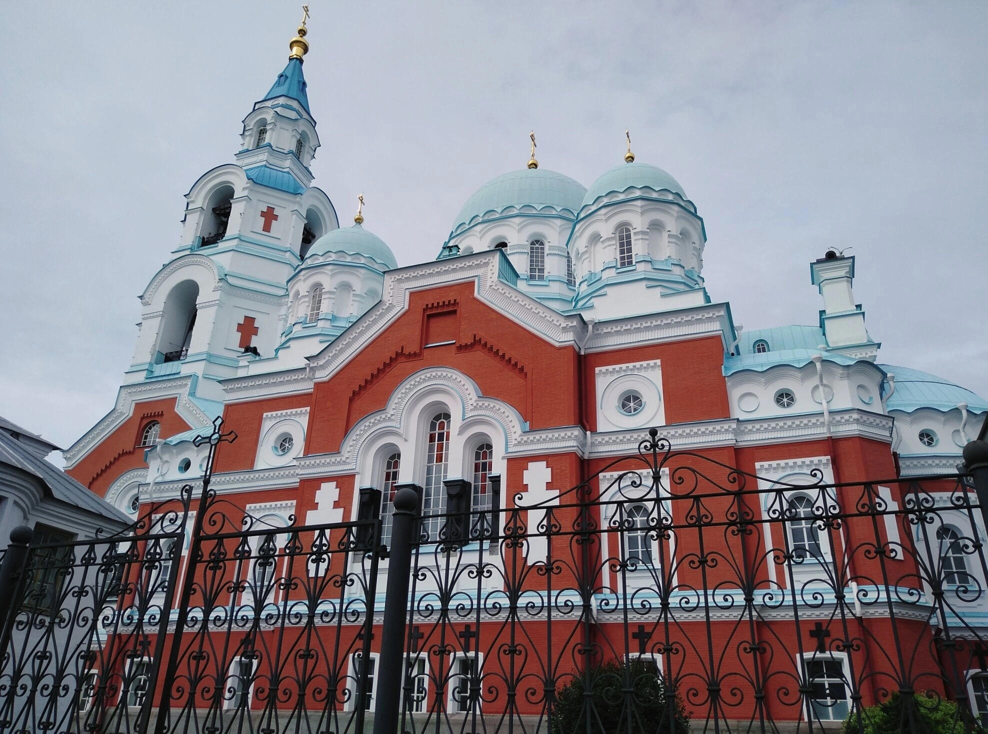 На переднем плане фотографии видна массивная кованая ограда с декоративными узорами и столбами, ограждающая территорию собора. За ней открывается вид на величественное здание с арочными окнами, декоративными фронтонами и элементами, характерными для русского церковного зодчества. Слева возвышается многоярусная звонница с синим куполом, справа – часть келейных корпусов. Небо над куполами чистое, что подчёркивает яркость красок архитектуры.
