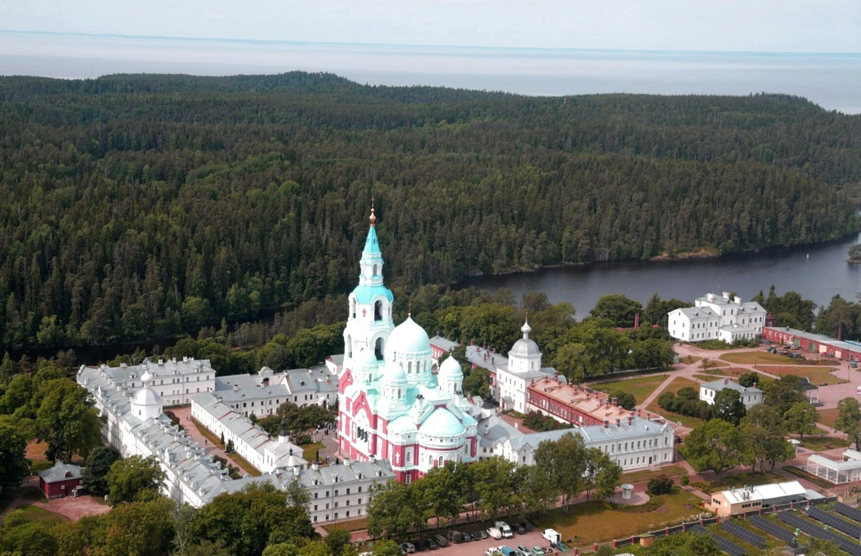 Храм окружён обширным четырёхугольником братских корпусов, образующих внутренний двор. Эти белоснежные двухэтажные здания с серыми скатными крышами исторически составляют монастырское каре. С правой стороны к комплексу подступают воды Ладожского озера, а сзади и по бокам его охватывает густой хвойный лес, простирающийся до горизонта. На переднем плане видны ухоженные дорожки, газоны и хозяйственные постройки, свидетельствующие о хозяйственной деятельности братии.