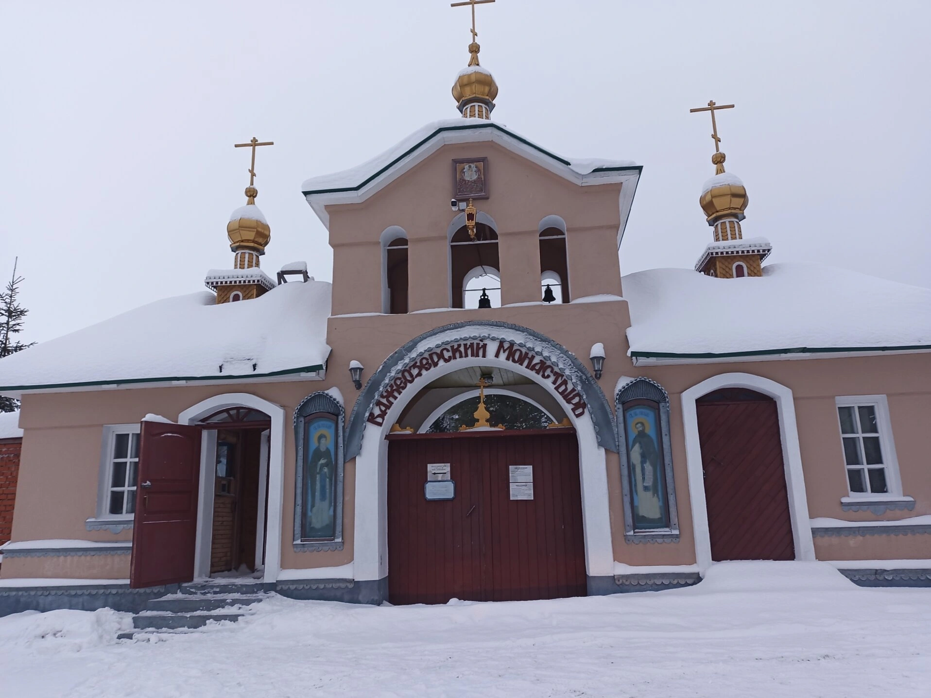 Над входом и по сторонам возносятся к пасмурному зимнему небу злаченые купола, увенчанные животворящими православными крестами. Эти купола сияют даже в рассеянном свете короткого зимнего дня, напоминая о нетварном Фаворском свете и славе Господней. Архитектурный облик строений, с их сдержанным декором и светлыми стенами, характерен для северного монастырского зодчества и несёт в себе отпечаток особой аскетичной простоты и строгости.