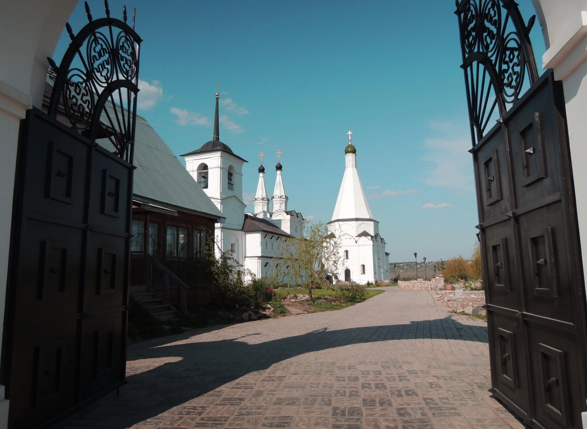 На святом месте, осенённом лазурным небом с легкими облаками, возвышаются благолепные храмы, сияющие белизной своих стен. Чётко видны златоглавые купола, увенчанные православными крестами, и стройная колокольня, устремлённая ввысь. Монастырские постройки, окружённые ухоженной зеленью, являют собой образец духовной гармонии и архитектурной строгости.