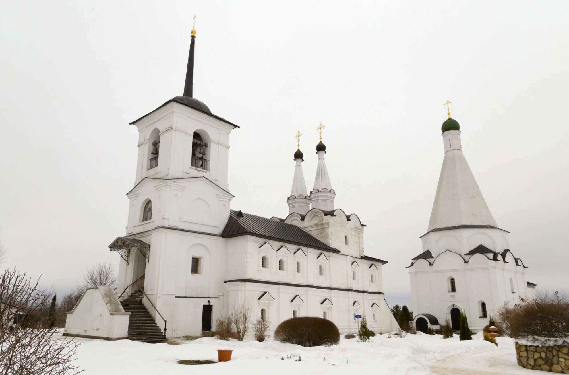 На снимке видны восстановленные храмы и строения монастырского комплекса, которые являют собой образец русского церковного зодчества. Белоснежные стены святых обителей гармонично сочетаются с тёмными куполами, устремлёнными в небесную высь, символизируя молитвенное горение к Богу. Архитектурный ансамбль включает в себя Преображенский собор, храм Введения Пресвятой Богородицы во Храм, а также колокольню и необходимые хозяйственные постройки, обнесённые оградой.