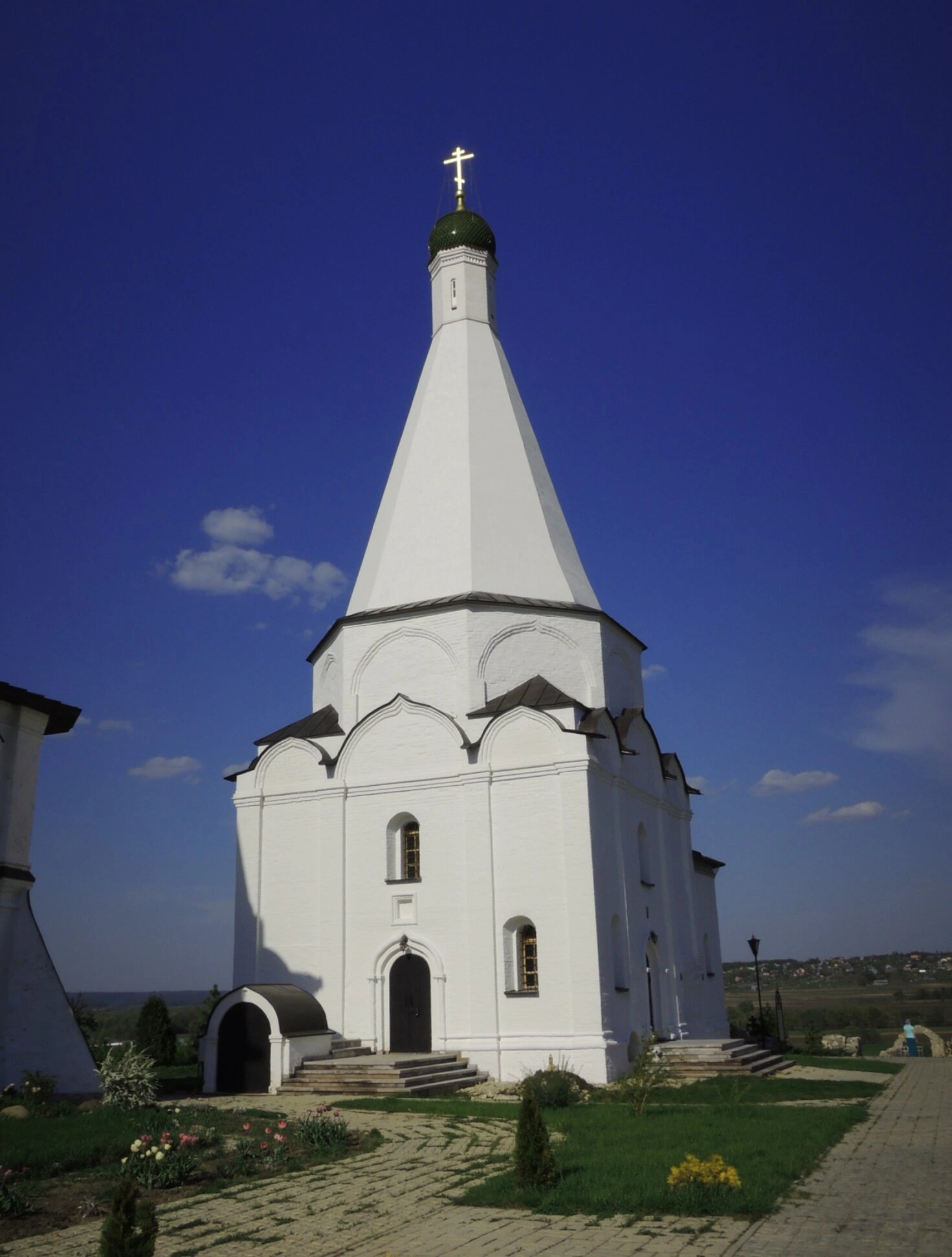 Главной доминантой монастырского комплекса, хорошо видной на снимке, является прекрасный Спасо-Преображенский храм с шатровым завершением. Его архитектура воплощает в себе лучшие традиции русского церковного зодчества. Белоснежные стены, устремлённые в небо главы и гармоничные пропорции создают образ возвышенной духовной красоты и молитвенного предстояния.