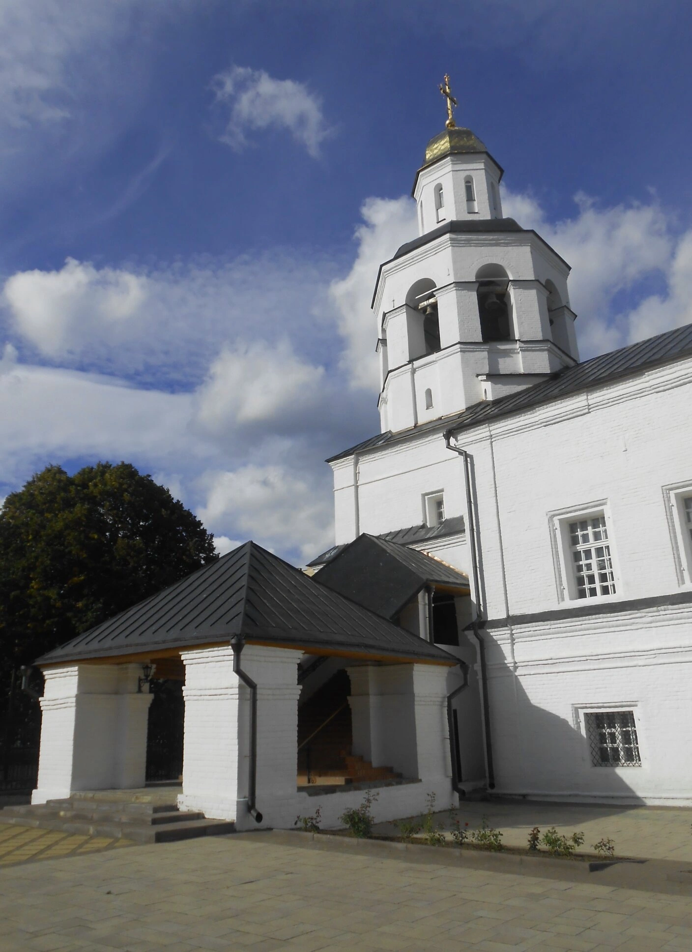 У входа в святыню можно видеть тёмный навес, под сенью которого верующие обретают благоговейное настроение перед входом в дом молитвы. На заднем плане фотографии угадываются очертания других монастырских строений и кроны деревьев, создающих атмосферу умиротворения и покоя. Небесная лазурь, частично скрываемая облаками, озаряет своими лучами святую обитель, подчёркивая её благодатную красоту и величие.