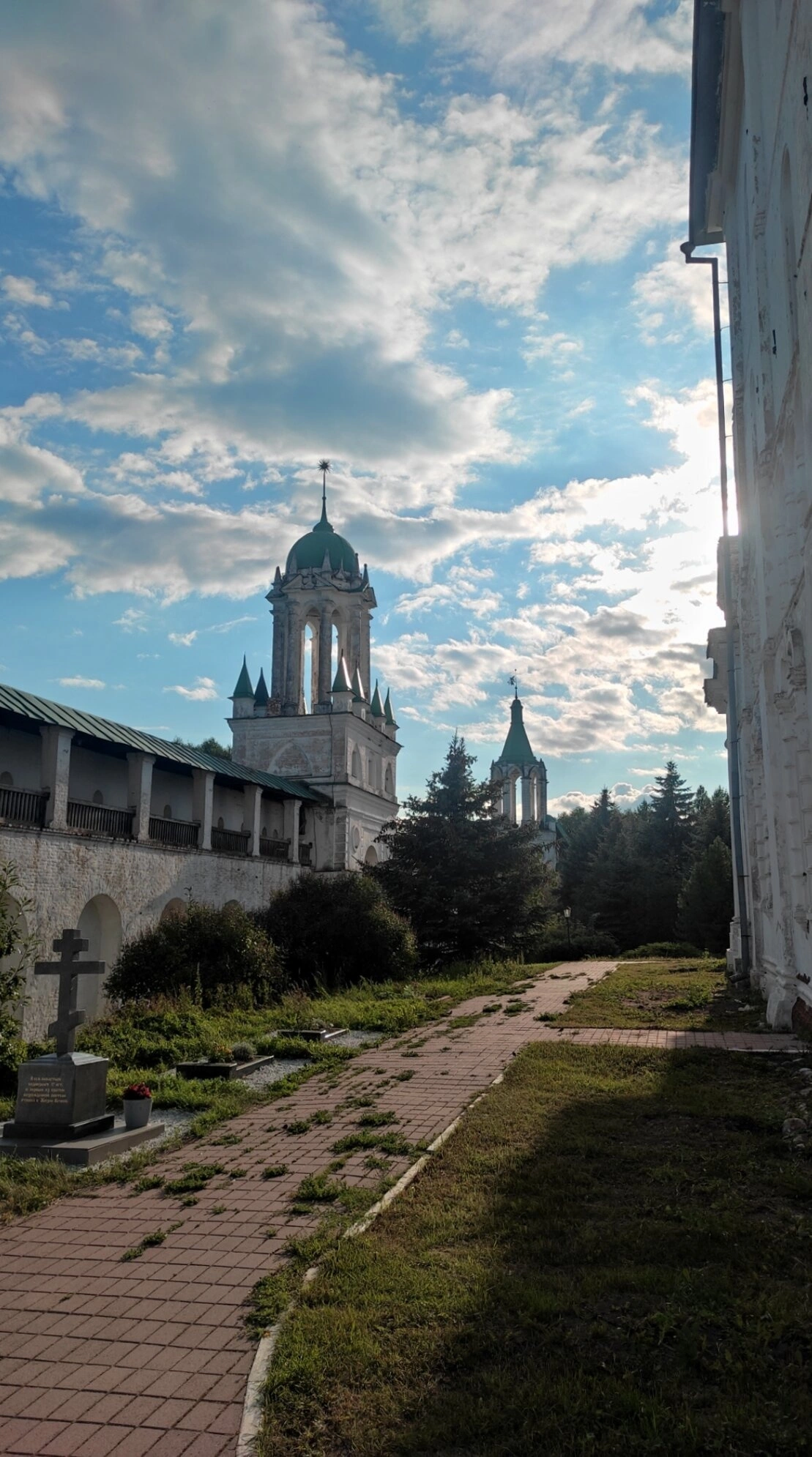 За стенами обители открывается вид на гладь озера Неро, придающего месту особое спокойствие и умиротворение. Небесная сфера с облаками, запечатлённая на снимке, подчёркивает благодатность и величие этого намоленного места, известного своими чудотворными святынями, среди которых особо почитаются мощи святителя Димитрия Ростовского.