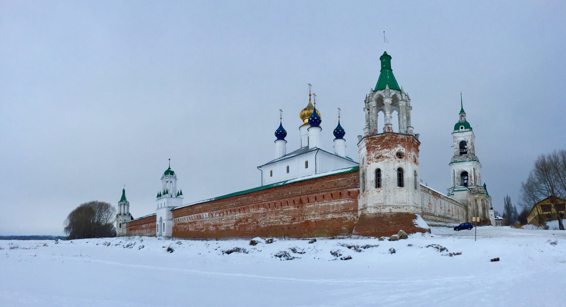 Чётко видны мощные стены и башни монастырской ограды, сложенные из красного кирпича, которые веками охраняют внутреннее пространство для молитвенных трудов. Над всем ансамблем возносятся к небу златоглавые купола храмов, сияющие даже в рассеянном свете зимнего неба. Главной доминантой является собор во имя святителя Димитрия Ростовского, чьи луковичные главы венчаются православными крестами, символом нашего спасения.