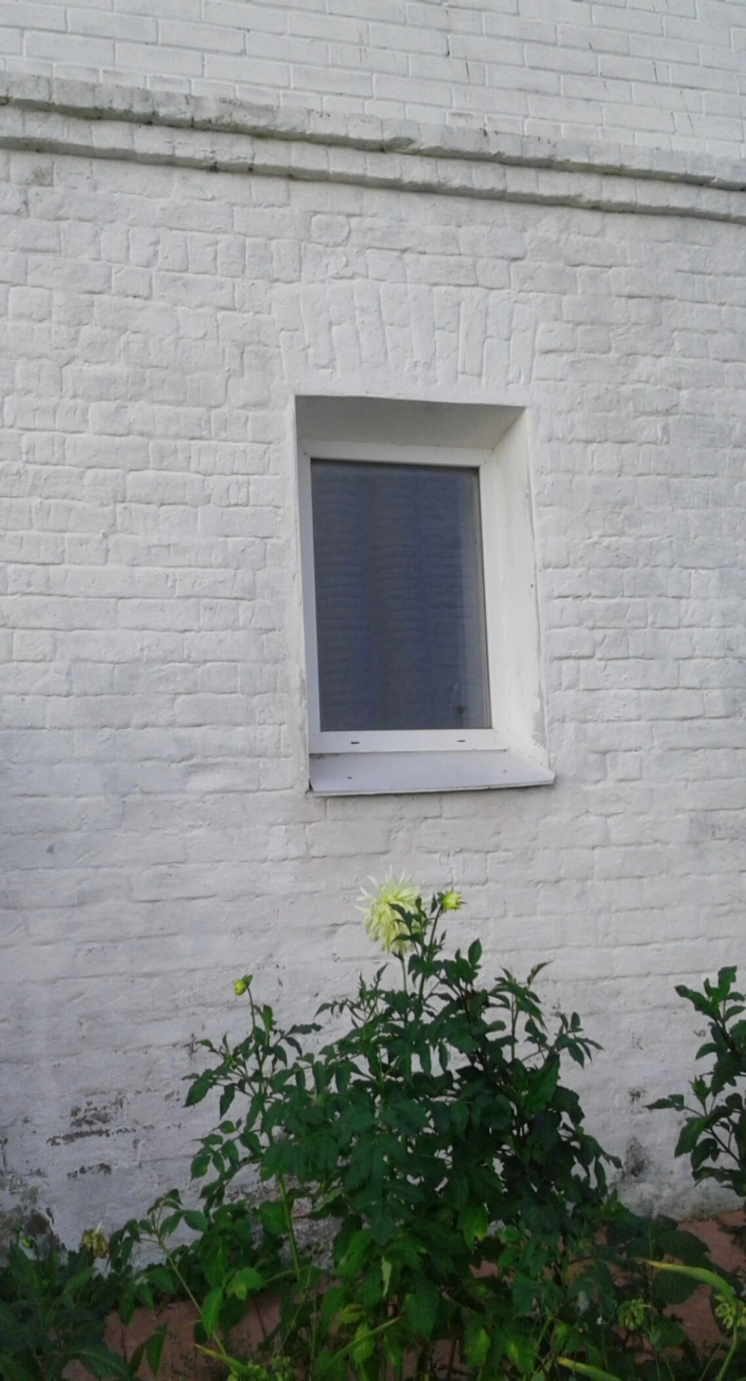 На представленной фотографии запечатлён фрагмент стены одного из знаменитых православных храмов города Шуи — Спасо-Преображенской церкви, более известной в народе как Мельничный храм. Снимок демонстрирует характерную для данного священного сооружения кирпичную кладку, выполненную из белого камня, и скромное оконное завершение, типичное для храмовой архитектуры конца XIX века.