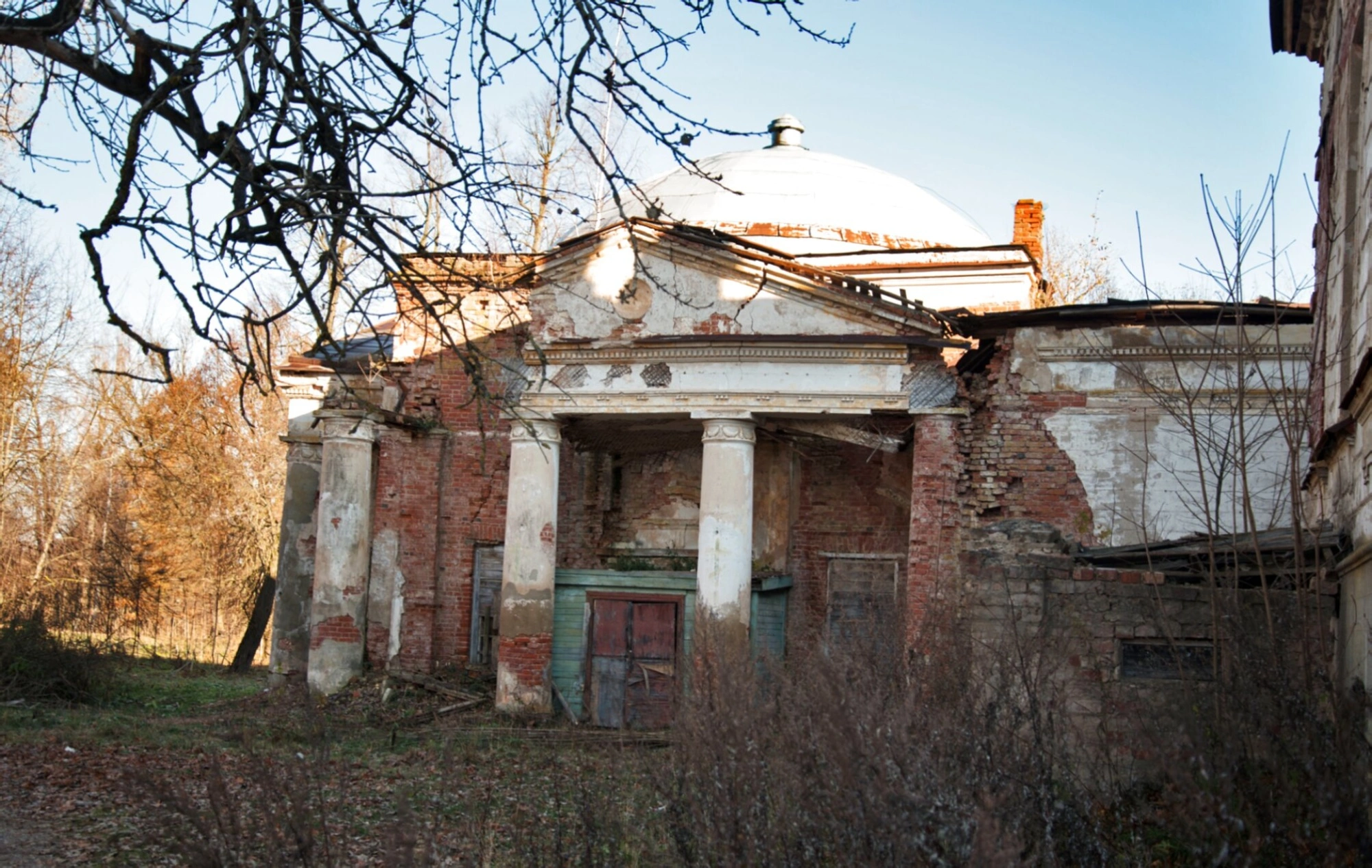 На представленной фотографии запечатлена Спасская церковь, расположенная на территории бывшей усадьбы Волышово в Порховском районе Псковской области. Храм был возведён в 1779 году по благословению правящего архиерея и на средства владельца имения, барона Сергея Васильевича Строганова, и освящён в честь Нерукотворного Образа Спасителя.