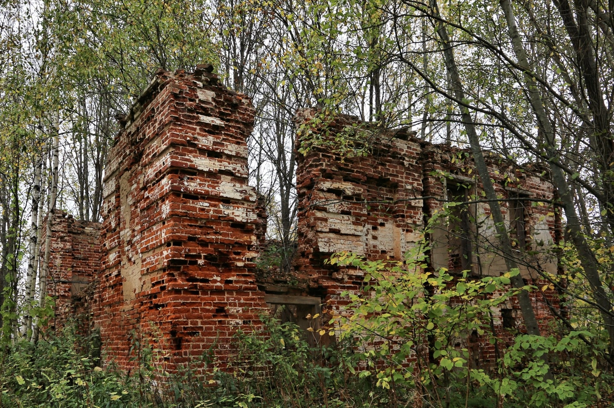 Сохранившиеся кирпичные дымоходы и фрагменты каменной кладки указывают на былую основательность постройки. Древесные поросли и кустарники, обильно покрывающие здание, создают атмосферу заброшенности и утраты. Крыша храма значительно повреждена, что неизбежно приводит к дальнейшему разрушению внутренних помещений.