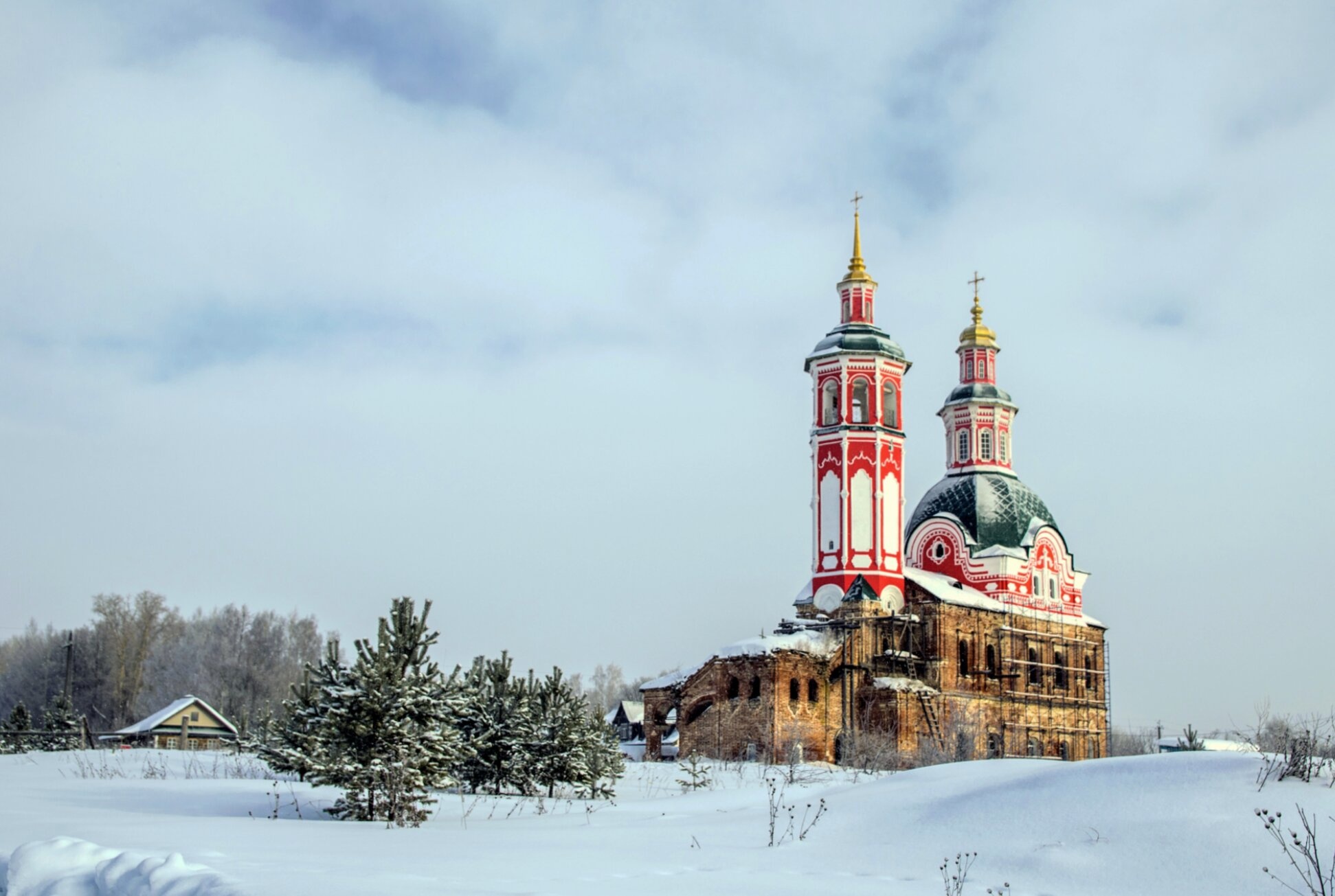 На представленной фотографии запечатлена величественная Спасская церковь, расположенная в селе Вяз Кирово-Чепецкого района Кировской области. Храм, освящённый в честь Нерукотворного Образа Спасителя, живописно возвышается посреди заснеженного поля, символизируя собой духовную твердыню и непреходящую веру.