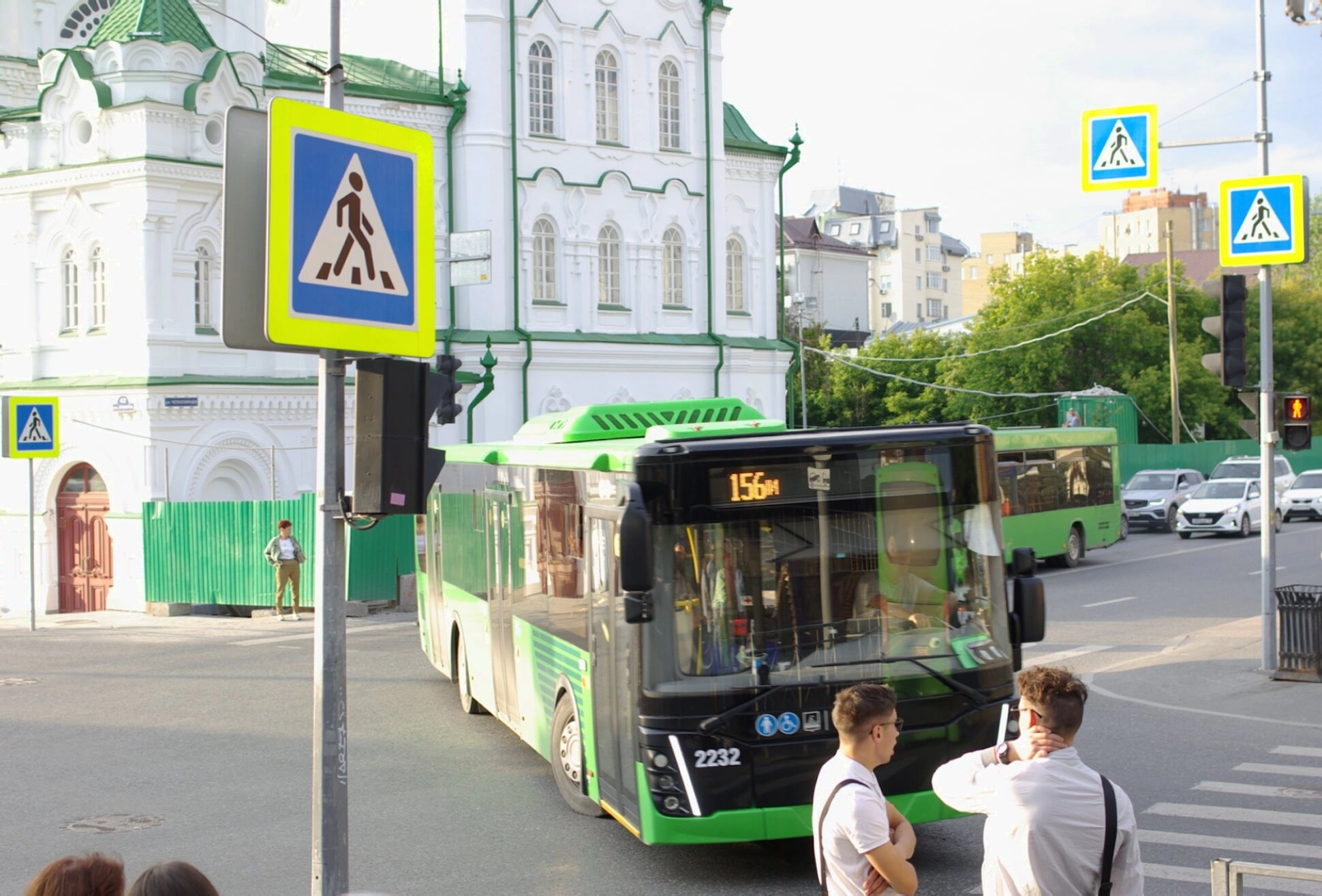 На переднем плане фотографии виден оживлённый городской перекрёсток улиц Республики и Орджоникидзе. Зелёный автобус ЛиАЗ, пешеходы, нанесённая зебра и предупреждающие знаки подчёркивают, что святыня неотделима от жизни горожан и органично вписана в городское пространство. Снимок передаёт особую атмосферу места, где каждый день мимо древних стен проходят сотни людей.