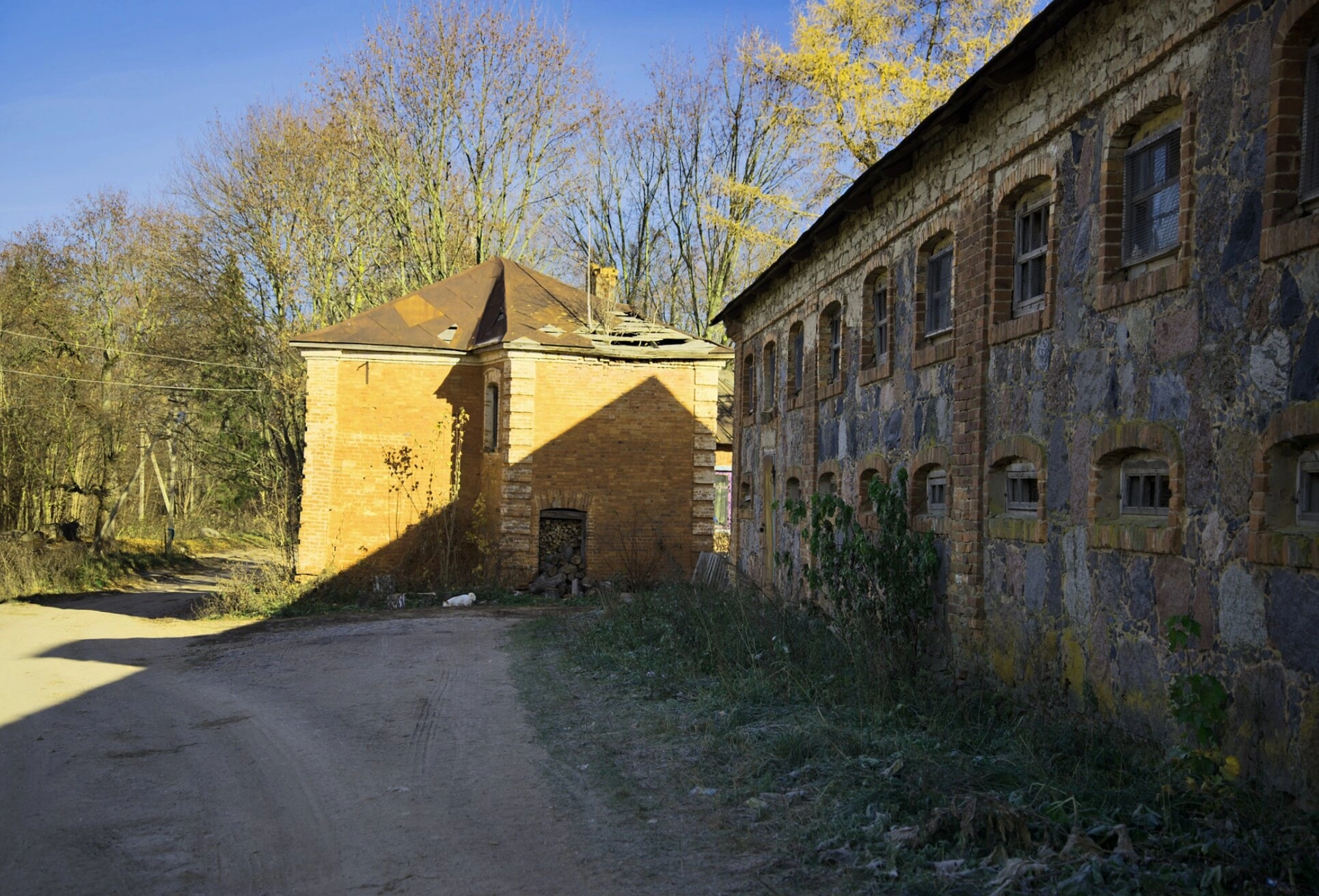 Слева расположено меньшее по размерам здание из красного кирпича, вероятно, хозяйственная постройка усадебного комплекса. Частично разрушенная кровля указывает на временной износ сооружения, что придает архитектурному ансамблю особый исторический шарм.