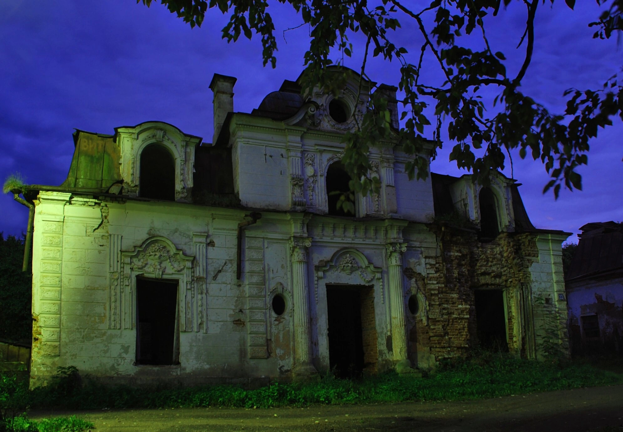На представленной фотографии запечатлена полуразрушенная Спасская церковь, расположенная на территории усадьбы Волышово в Порховском районе Псковской области. Снимок выполнен в час сумерек, когда угасающий свет дня придает древним стенам особое благоговение и напоминает о бренности земного бытия.