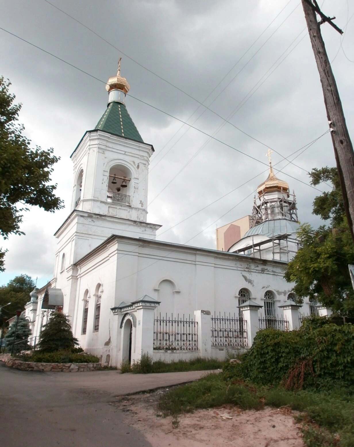 Территория вокруг храма благоустроена и ограждена ажурным металлическим забором. За оградой виднеются кроны деревьев, что создаёт ощущение уединённости и покоя. Снимок сделан с улицы, на переднем плане которого проходит дорога, что подчёркивает расположение храма в городской среде. Присутствие деревянной опоры с линиями электропередач указывает на современность момента фотографирования.
