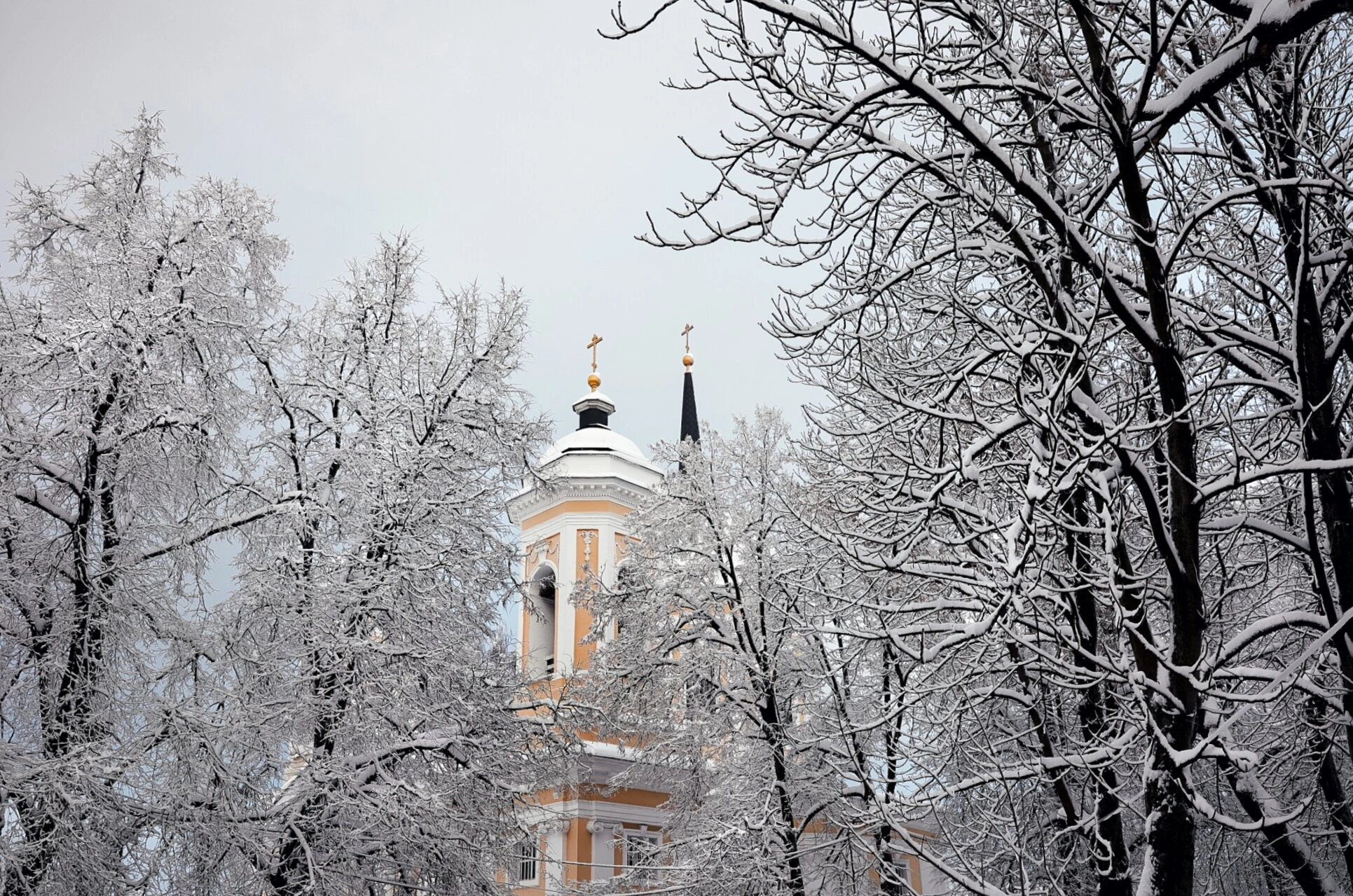 На представленной фотографии запечатлён величественный Спасский храм, расположенный в городе Балашиха Московской области, в период зимних морозов. Святыня, укрытая белоснежным покровом, стоит в окружении запорошённых снегом деревьев, что создаёт атмосферу благоговейной тишины и спокойствия.