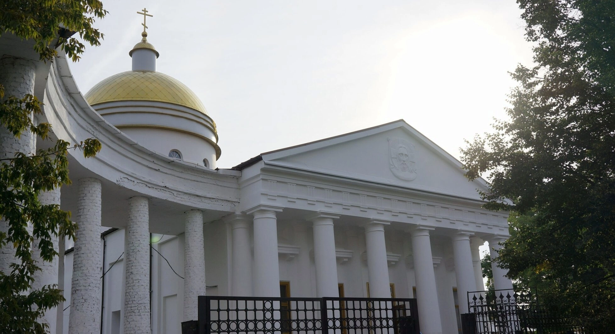 Внимательный взгляд отмечает детали: изогнутую стену с колоннами, обрамляющую вход, и тёмный декоративный забор перед храмовой территорией. На фронтоне можно различить барельефный герб. Святыня утопает в зелени деревьев и кустарников, что создаёт ощущение уединённости и покоя. Фотография сделана в светлое время суток; небо, запечатлённое в кадре, светлое, а солнечный свет, возможно, мягко пробивается сквозь листву, озаряя божий дом.