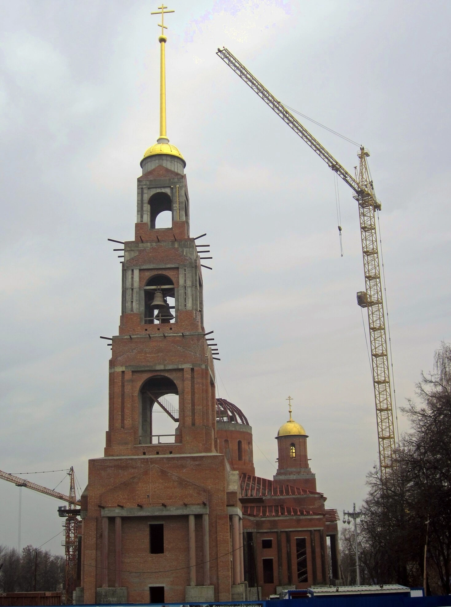 Над основным прямоугольным объёмом здания устремляются в небо пять мощных световых барабанов, увенчанных златоглавыми куполами с крестами, символизирующими Христа и четырёх евангелистов. Рядом высится многоярусная колокольня со шпилем, который также завершает золотой крест. Присутствие строительного крана на фото указывает на активную фазу реконструкции, возвращающую храму его былое благолепие после десятилетий запустения в советский период.