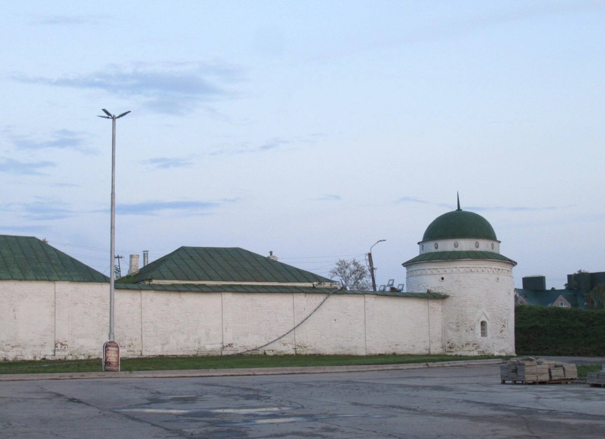 На представленной фотографии запечатлена часть древнейшей православной обители — Спасо-Преображенского мужского монастыря, что пребывает в историческом сердце Рязани, на территории ее величественного кремля. Изображение являет нашему взору могучую каменную башню, увенчанную благодатным зеленым куполом, на котором возвышается златоглавый крест, сияющий во славу Господа.