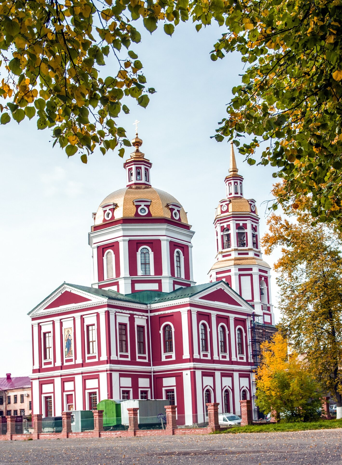 На представленной фотографии запечатлён величественный Спасский собор, находящийся в городе Кирове. Этот православный храм, освящённый в честь Нерукотворного Образа Спасителя, является одной из духовных доминант и архитектурных жемчужин Вятской земли. Снимок сделан в прекрасное время года — золотую осень, когда пышное убранство деревьев на площади окружает бело-красное здание собора, создавая умиротворяющий и торжественный образ.