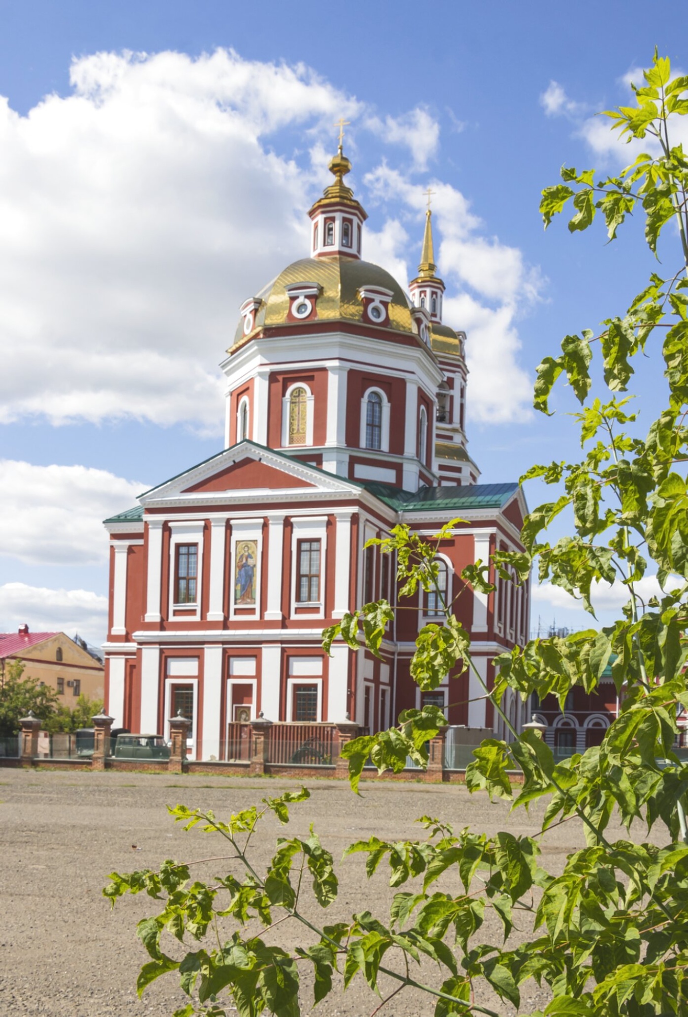 На представленной фотографии запечатлён величественный Спасский собор, также известный как Собор Спаса Нерукотворного Образа, — один из духовных центров города Кирова. Этот православный храм, расположенный по адресу: улица Казанская, 50, является выдающимся памятником церковной архитектуры и объектом культурного наследия.