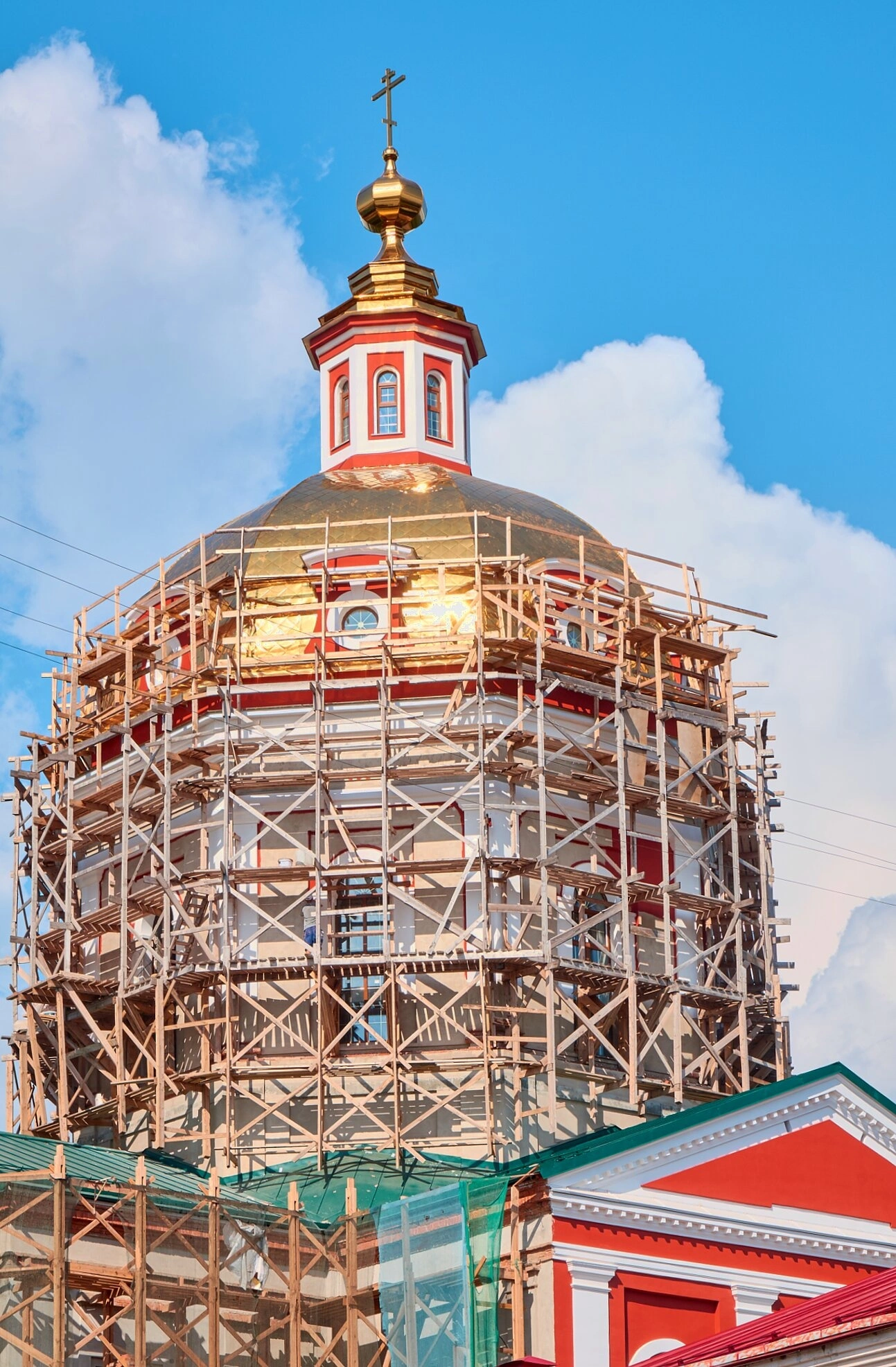 Золотой купол собора, сияющий даже сквозь строительные конструкции, традиционно символизирует горний мир и славу Господню. Венчающий его крест устремлён в небеса, напоминая о молитвенном предстоянии. На переднем плане фотографии видна часть кирпичного здания с зелёной кровлей, что является характерной деталью застройки старинного монастырского комплекса, основанного преподобным Трифоном Вятским в XVI столетии.