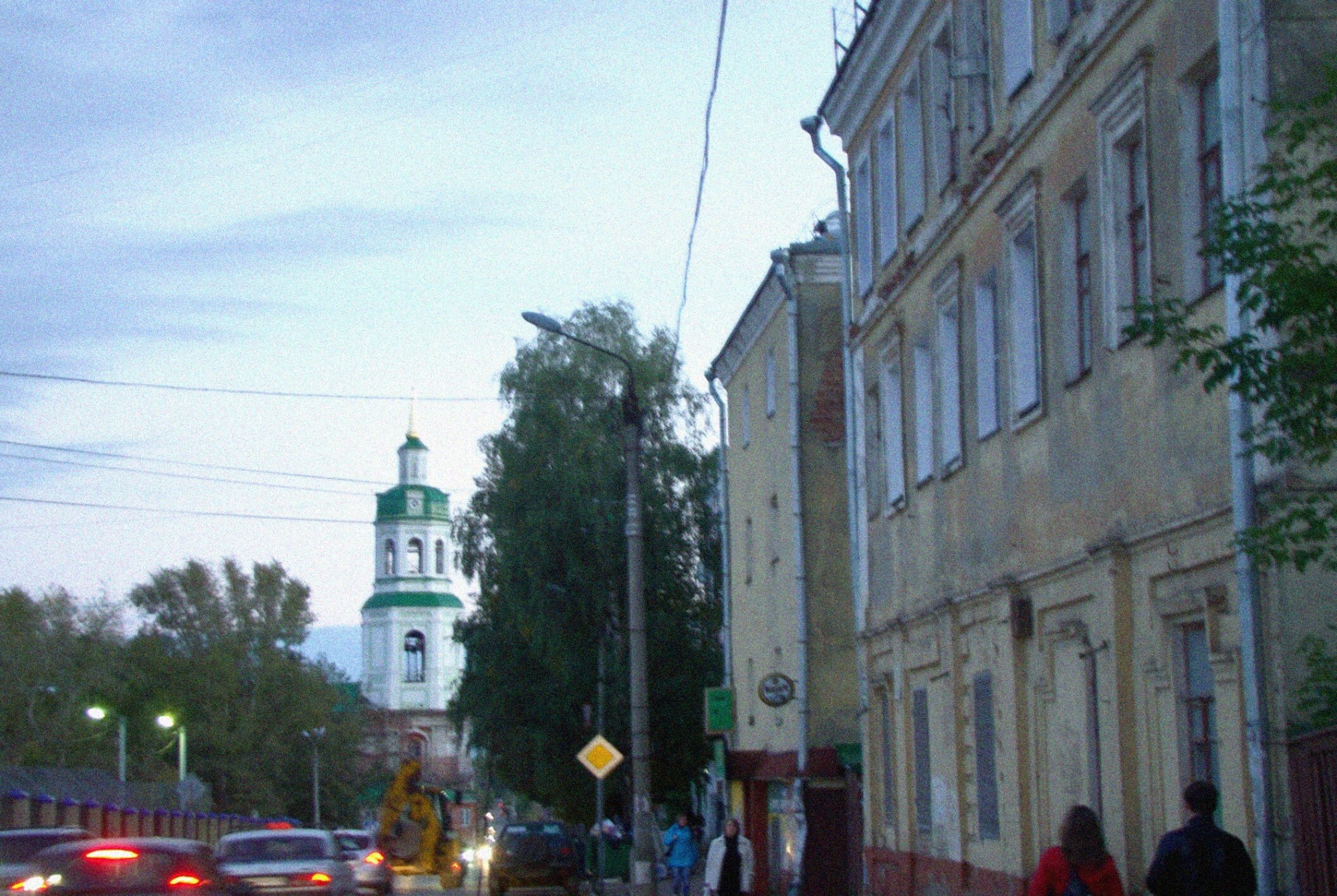 На фотографии запечатлён вид на старинную улицу города Кирова (бывшая Вятка), упирающуюся в величественный силуэт Спасского собора. Храм, освящённый в честь Нерукотворённого Образа Спасителя, является одним из духовных символов города и выдающимся памятником русской церковной архитектуры.