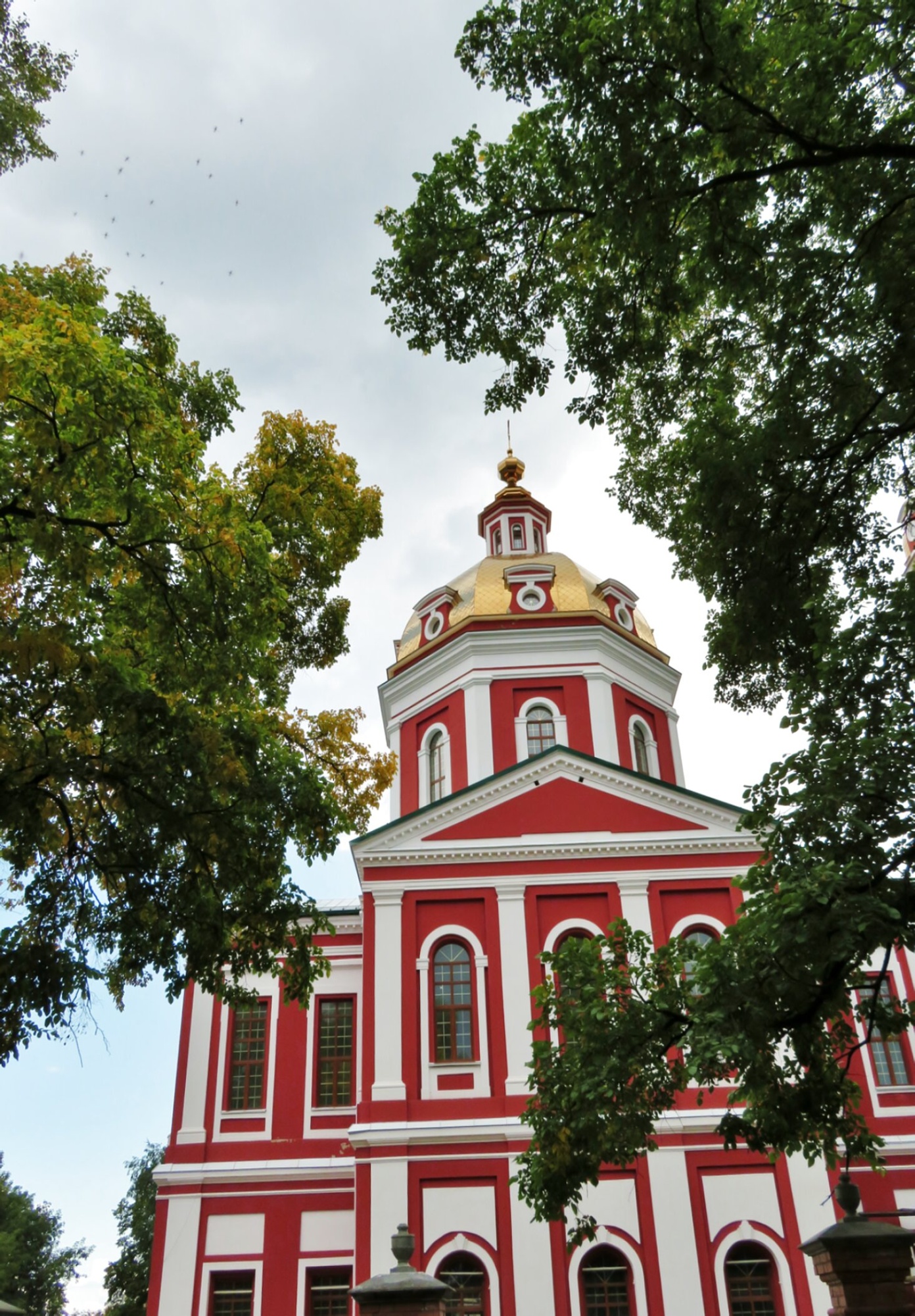 Собор был возведён в 1818 году и представляет собой прекрасный образец классицизма в сакральном зодчестве. На снимке хорошо просматривается монументальный основной объём храма, увенчанный мощным световым барабаном с золочёной главой, которая гордо сияет под небом. Фасад здания, выкрашенный в традиционное сочетание красного и белого цветов, украшен строгими пилястрами и арочными оконными проёмами, что придаёт ему особую торжественность и величие.