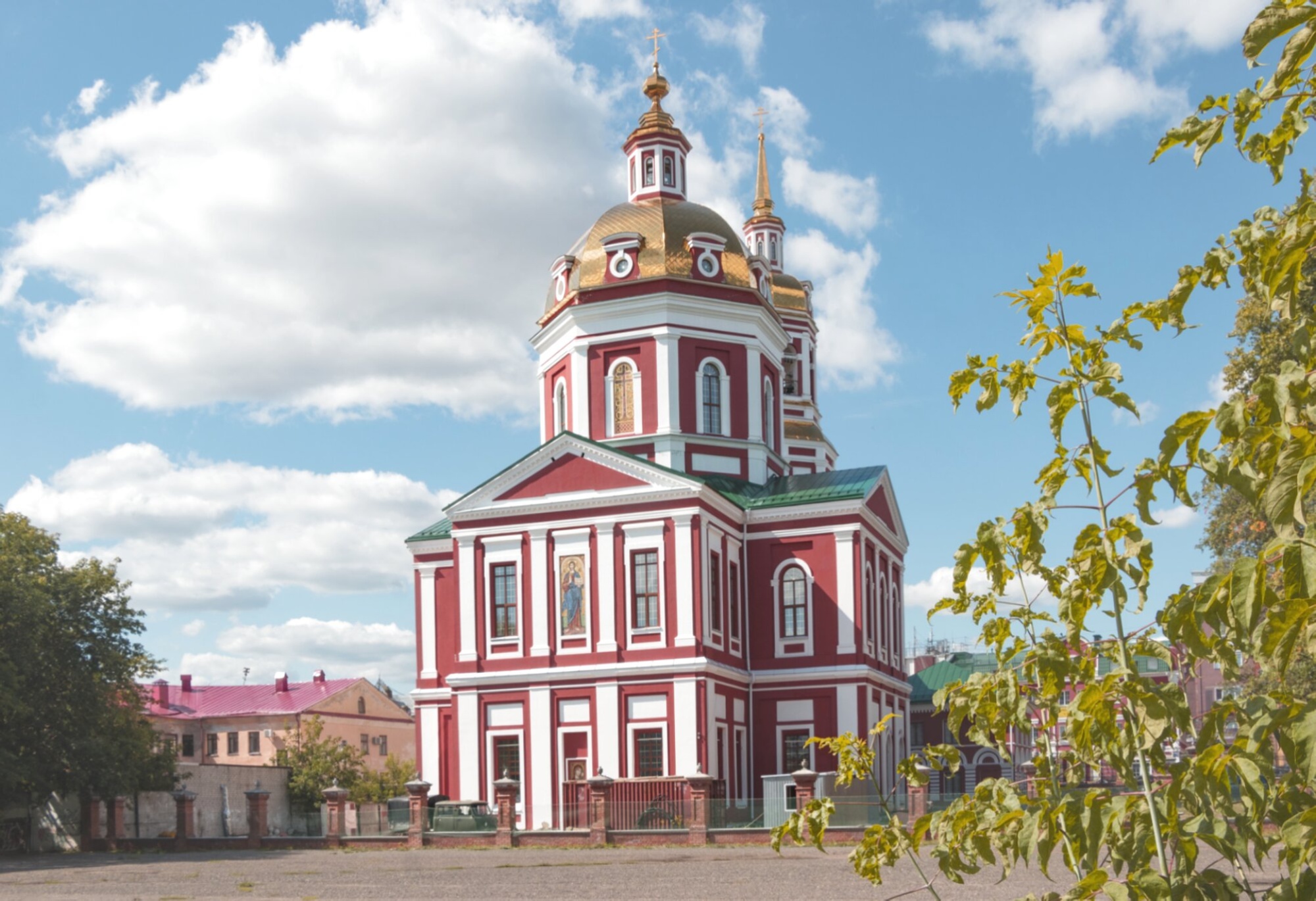 Фотография передаёт особую атмосферу спокойствия и величия, окружающую святое место. Снимок сделан в погожий летний день: пушистые облака создают живописный фон, подчёркивая монументальность архитектурных форм. Зелёные кроны деревьев, обрамляющие собор с правой стороны, добавляют кадру естественной гармонии и уюта. На заднем плане виднеются элементы городской застройки, что напоминает о неразрывной связи духовной истории и современной жизни города.