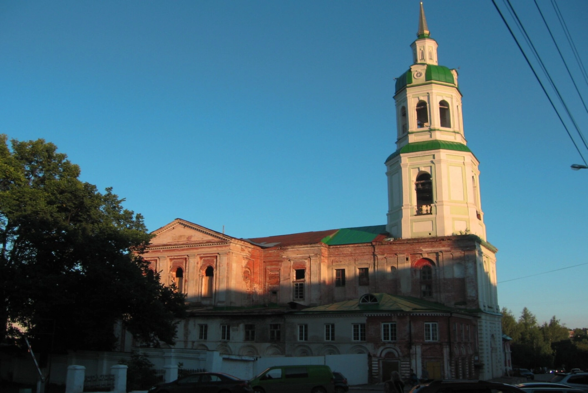 Архитектурный облик собора являет собой благородное сочетание традиций русского зодчества и стиля классицизма. Высокая многоярусная колокольня, увенчанная остроконечным шпилем, гордо устремляется в небо, доминируя в окружающем пространстве. Основной объём храма украшает строгий портик с колоннами и треугольным фронтоном, что придаёт ему особую торжественность и величие. Фасад здания украшают арочные окна, декоративные карнизы и пилястры. На фотографии хорошо виден характерный цветовой контраст: зелёные купола и шпиль ярко выделяются на фоне светлых стен собора.