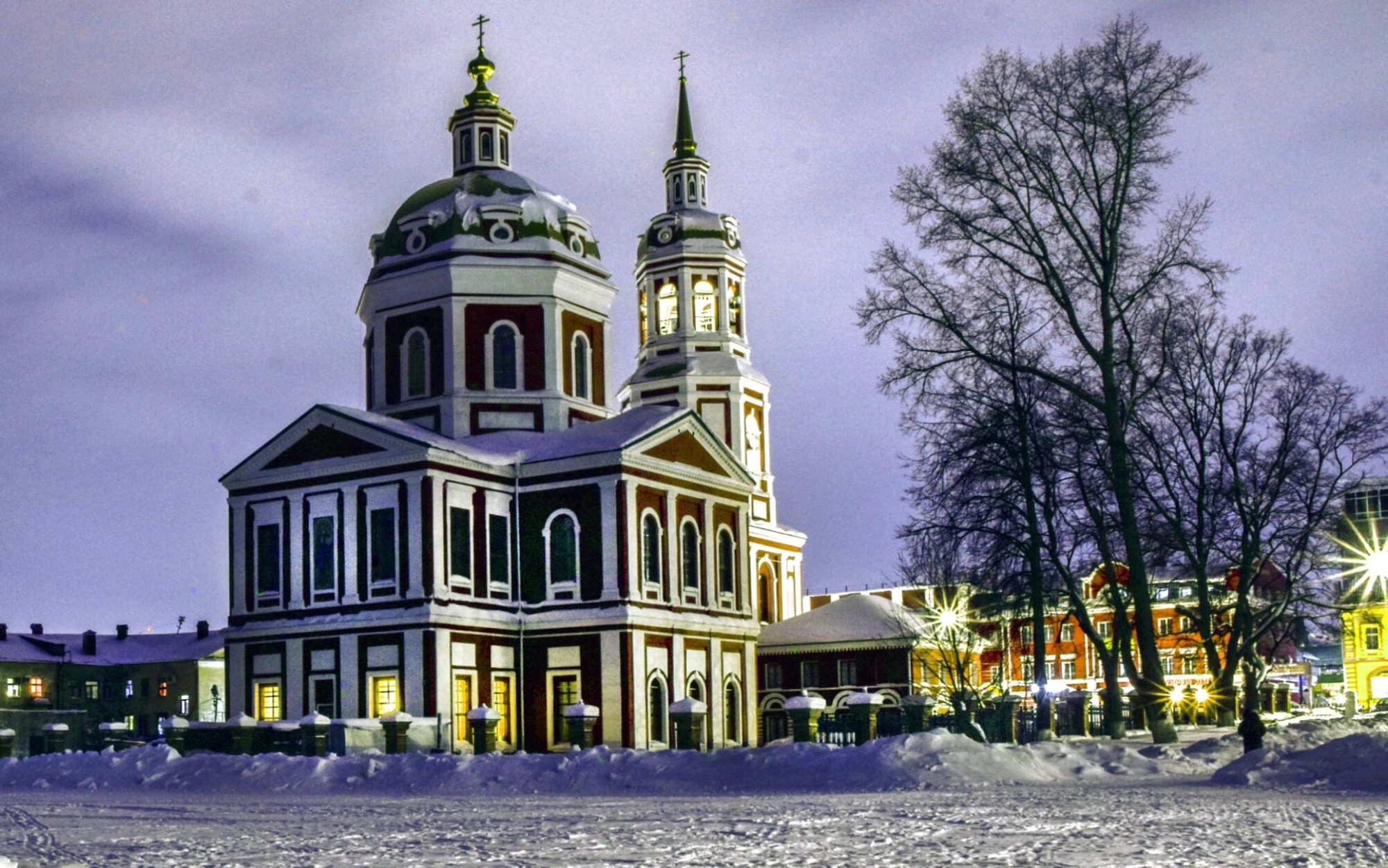 Обильный снежный покров, укутавший землю, и голые ветви деревьев красноречиво свидетельствуют о глубокой зиме — времени духовного сосредоточения и тишины. Освещённые окна близлежащих городских построек говорят о жизни вокруг святого места, гармонично вписанного в городской ландшафт. Данная фотография не просто фиксирует архитектурный объект, но и передаёт глубокое молитвенное настроение, напоминая о вечных ценностях и красоте православной веры, воплощённой в камне.