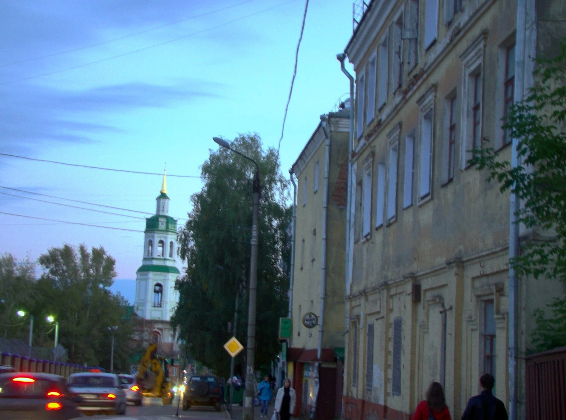 На фотографии запечатлён величественный вид Спасского собора города Кирова в таинственный час вечерних сумерек. На переднем плане открывается вид на тихую улицу, озарённую мягким светом уличных фонарей. Движение автомобилей оставляет на проезжей части светящиеся шлейфы, добавляя динамики в спокойную атмосферу древнего города.