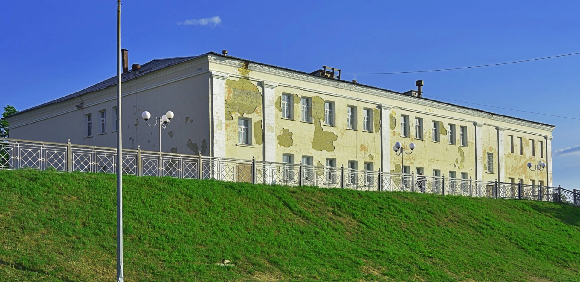 Здание церкви выполнено в традициях православного храмового зодчества. На снимке виден светлый одноэтажный храм, фасад которого демонстрирует следы времени. Перед церковью простирается зелёный травяной склон, ограждённый белым металлическим забором, что создаёт гармоничное природное обрамление для святыни.