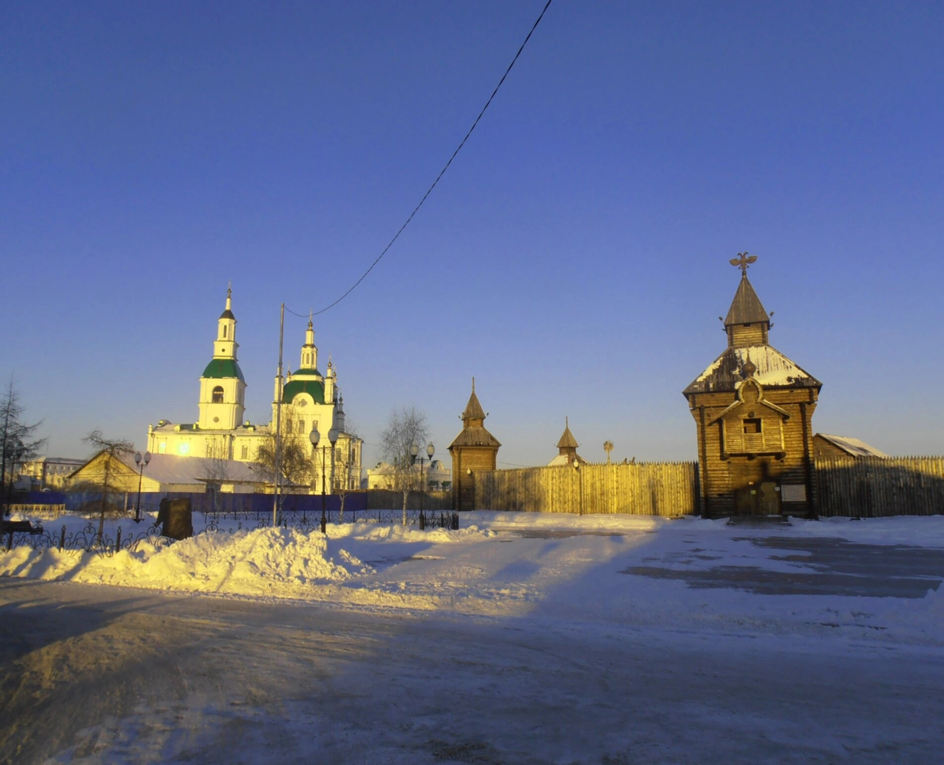 На представленной фотографии запечатлён величественный вид зимнего Ялуторовска, где центральное место занимает Сретенский собор — православный храм, освящённый в честь Сретения Господня. Рядом с собором располагается часть реконструированного Ялуторовского острога, являющегося ныне музейным комплексом под открытым небом. Заснеженная территория перед сими историческими сооружениями и ясное небо на заднем плане создают атмосферу благоговейной тишины и спокойствия, свойственную зимним дням в Сибири.