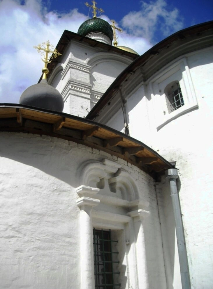 На представленной фотографии запечатлен фрагмент архитектурного ансамбля Сретенского ставропигиального мужского монастыря, одной из самых почитаемых православных обителей столицы. Снимок позволяет детально рассмотреть характерный для русского церковного зодтельства элемент — белоснежную оштукатуренную стену с арочным оконным проемом, обрамленным скромным декоративным архивольтом. Четкость линий и лаконичность форм свидетельствуют о традициях храмового строительства.