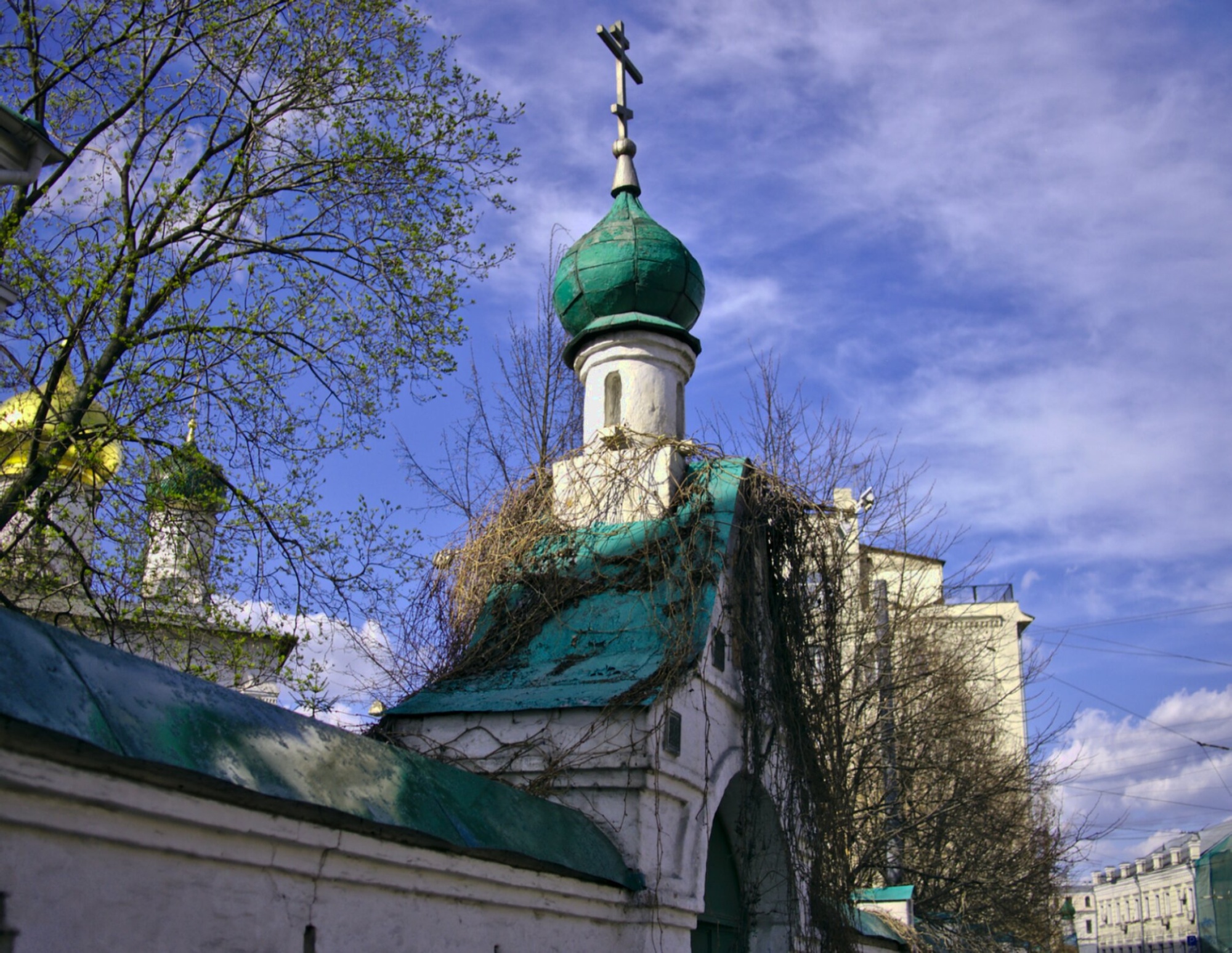 На представленной фотографии запечатлён вид на Сретенский ставропигиальный мужской монастырь, одну из древнейших и наиболее почитаемых православных обителей столицы. Монастырь был основан в 1397 году великим князем Василием I на месте сретения (встречи) Владимирской иконы Божией Матери, чудесно избавившей Москву от нашествия Тамерлана. С тех пор обитель является непрестанным молитвенным щитом города и важным духовным центром.