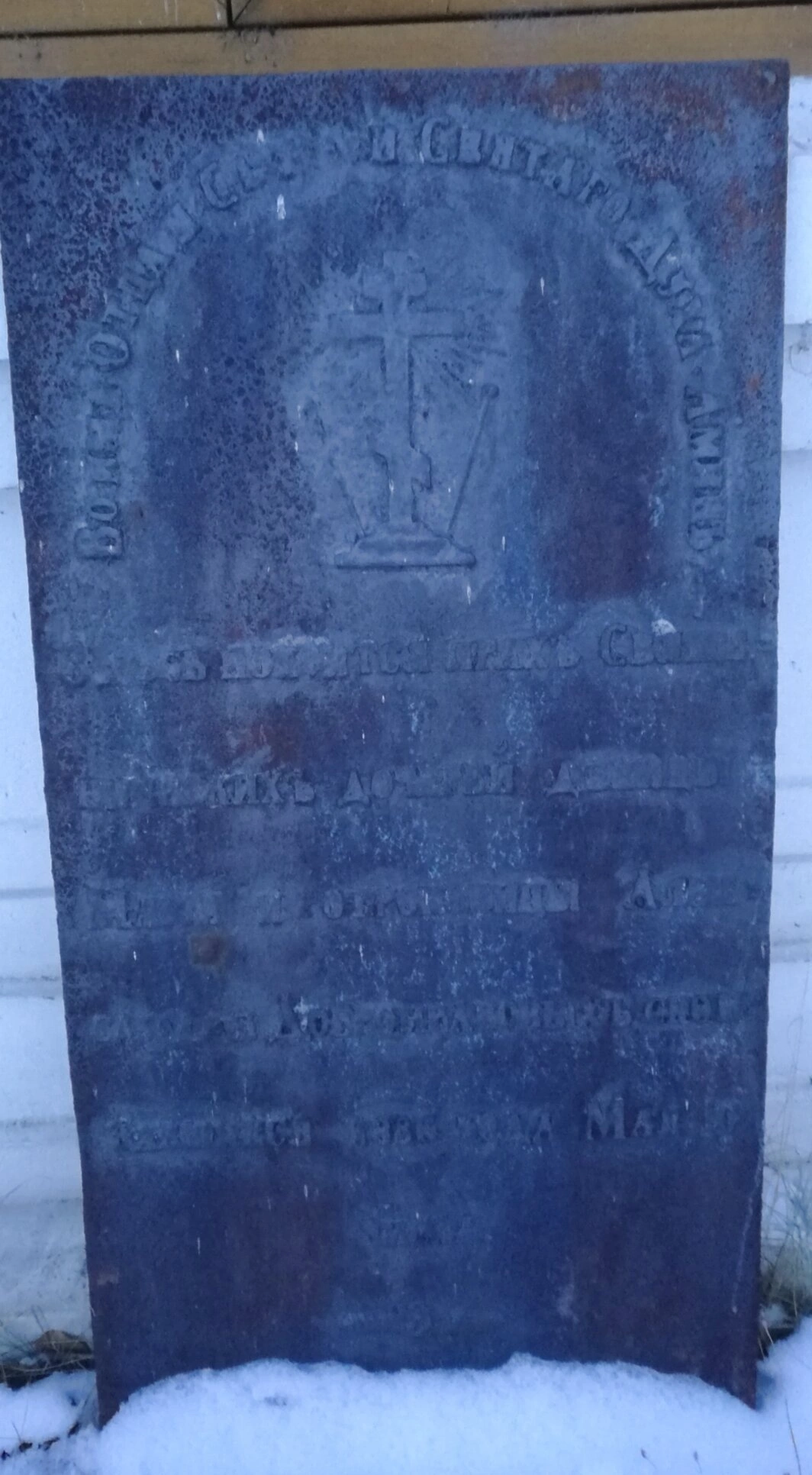 Данная каменная плита, вероятно, относится к XIX веку и является одним из немногих уцелевших материальных свидетельств старого погоста. Её рельефный декор, включающий крест и полукруглую арку, характерен для православной погребальной традиции того времени.
