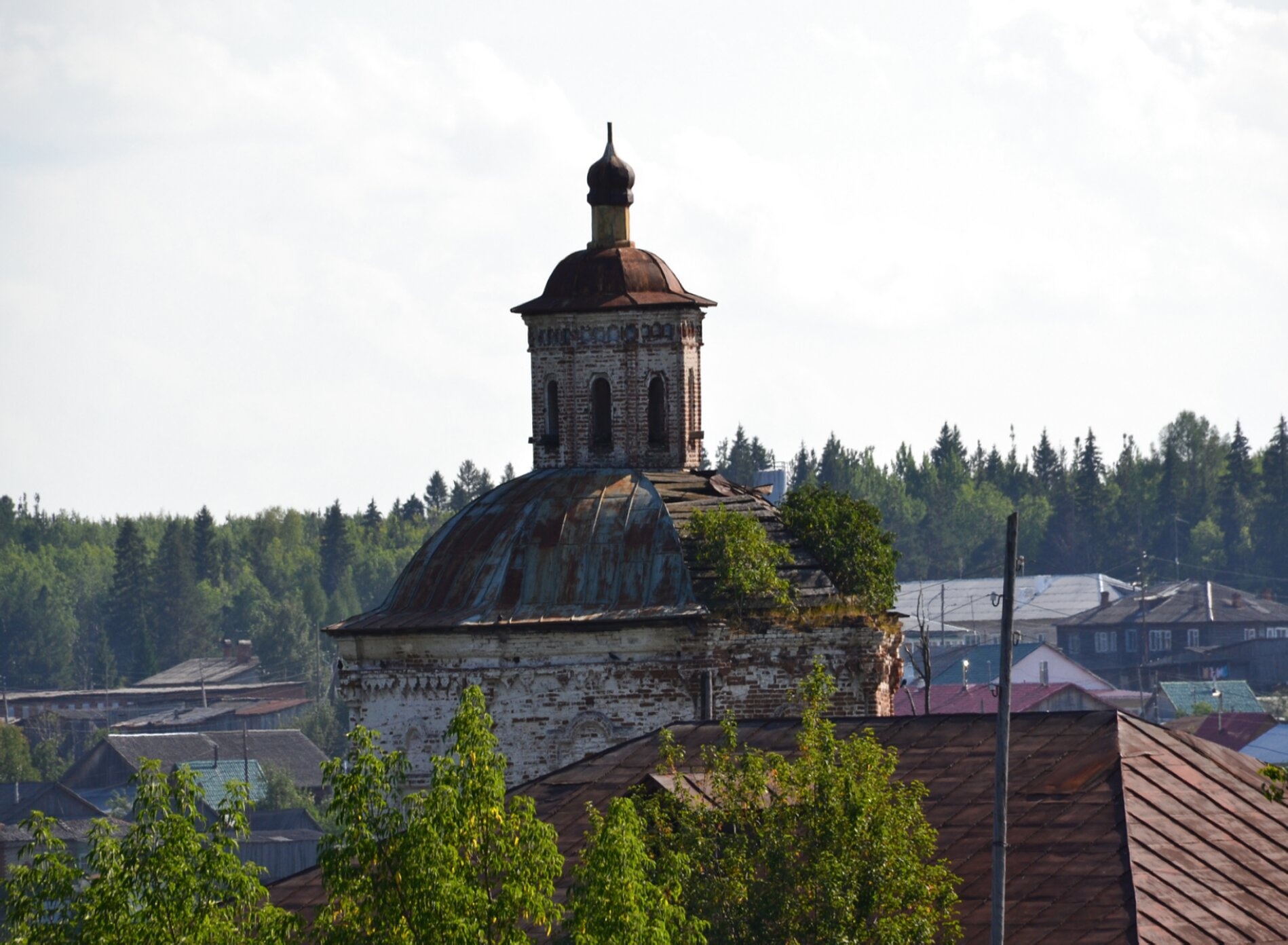 На заднем плане фотографии просматриваются крыши других строений и деревья, что указывает на расположение святой обители в городской черте. Нынешний вид храма является молчаливым напоминанием о богатой духовной истории Верхотурья, которое издавна считается православной жемчужиной Урала. Этот архитектурный памятник требует немедленных реставрационных работ для сохранения уникального историко-культурного наследия для будущих поколений.