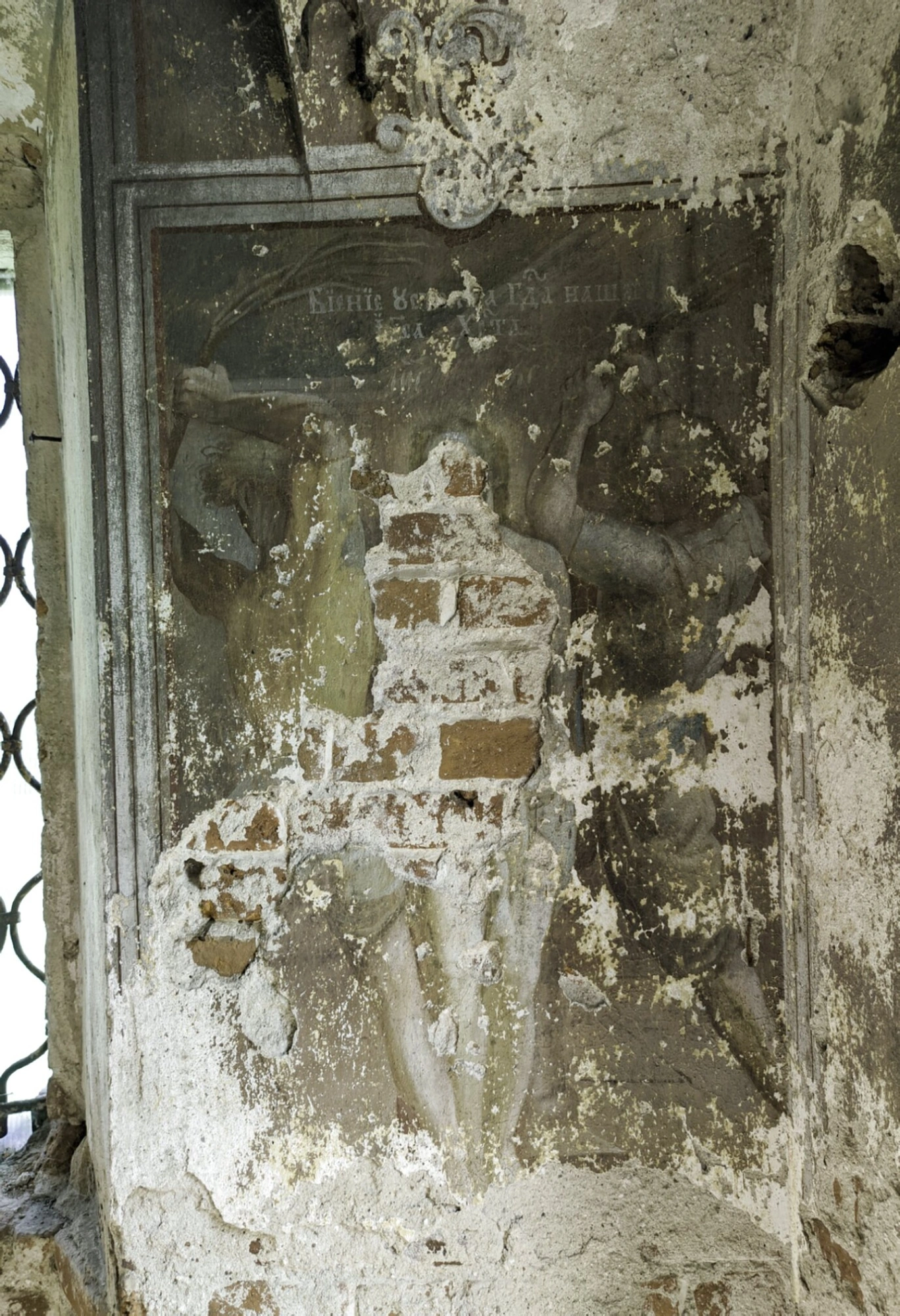 На представленной фотографии запечатлен фрагмент старинной фрески, сохранившейся на кирпичной стене в храме во имя преподобного Алексия, человека Божьего, что в селе Новоалексеевка Владимирской земли. Священное изображение, хотя и подверглось воздействию времени, сохраняет черты православной иконописной традиции, характерной для храмовых росписей русского севера.