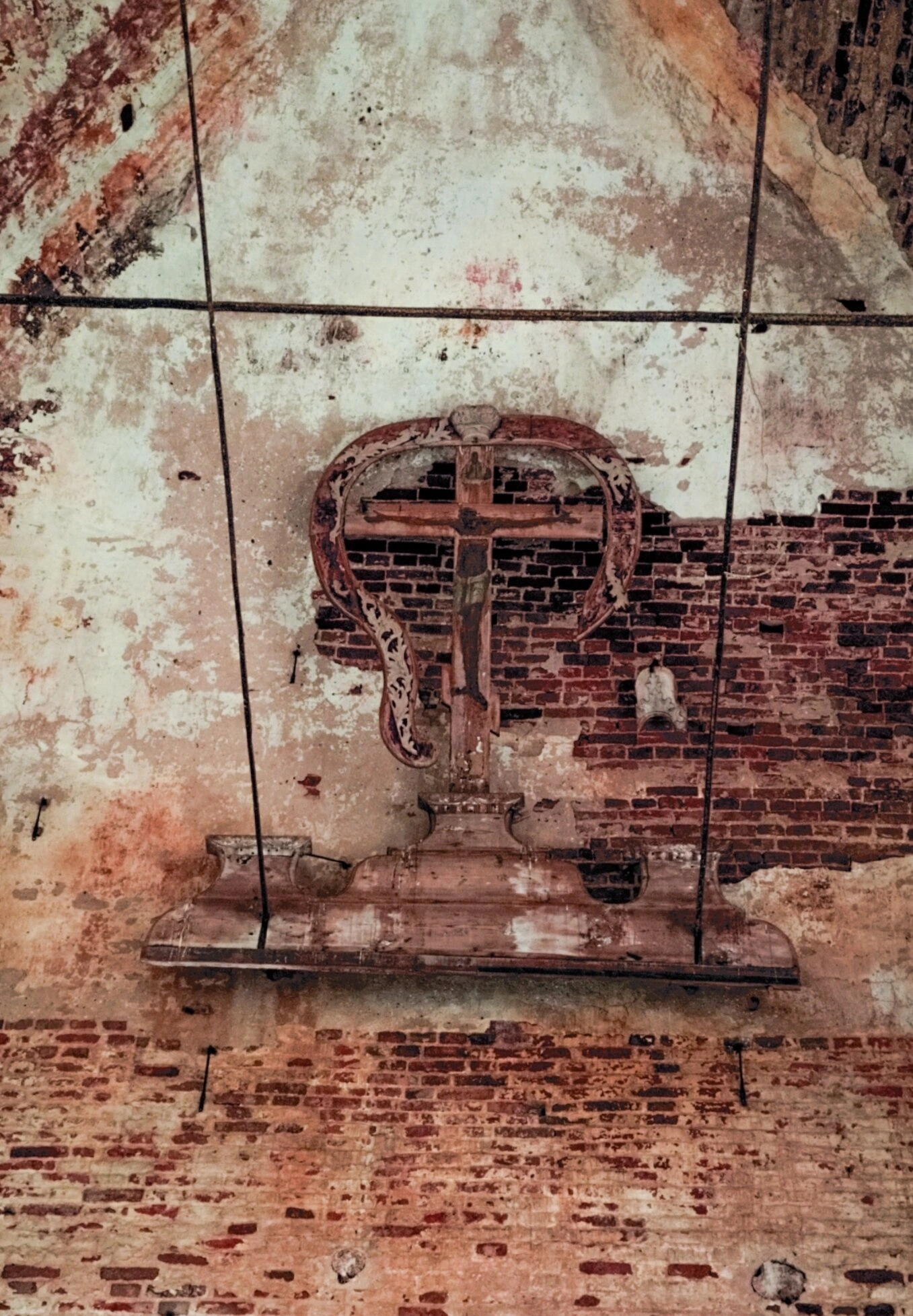 На представленной фотографии запечатлено старинное деревянное распятие, установленное на массивном резном постаменте. Священный образ размещён на стене из кирпичной кладки с частично осыпавшейся штукатуркой, что свидетельствует о почтенном возрасте храмовой конструкции.
