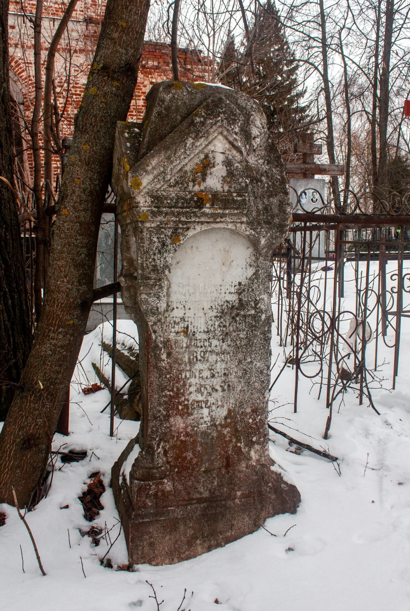 Слева от надгробия виден ствол векового дерева с отслоившейся корой, а также несколько тонких голых ветвей. На заднем плане различима ажурная металлическая ограда с традиционными православными узорами, ограждающая территориь церковного погоста, а также кирпичная стена самого храма. Земля вокруг покрыта чистым слоем снега, из-под которого проглядывают сухие ветки и прошлогодняя листва, создавая умиротворённый зимний пейзаж.